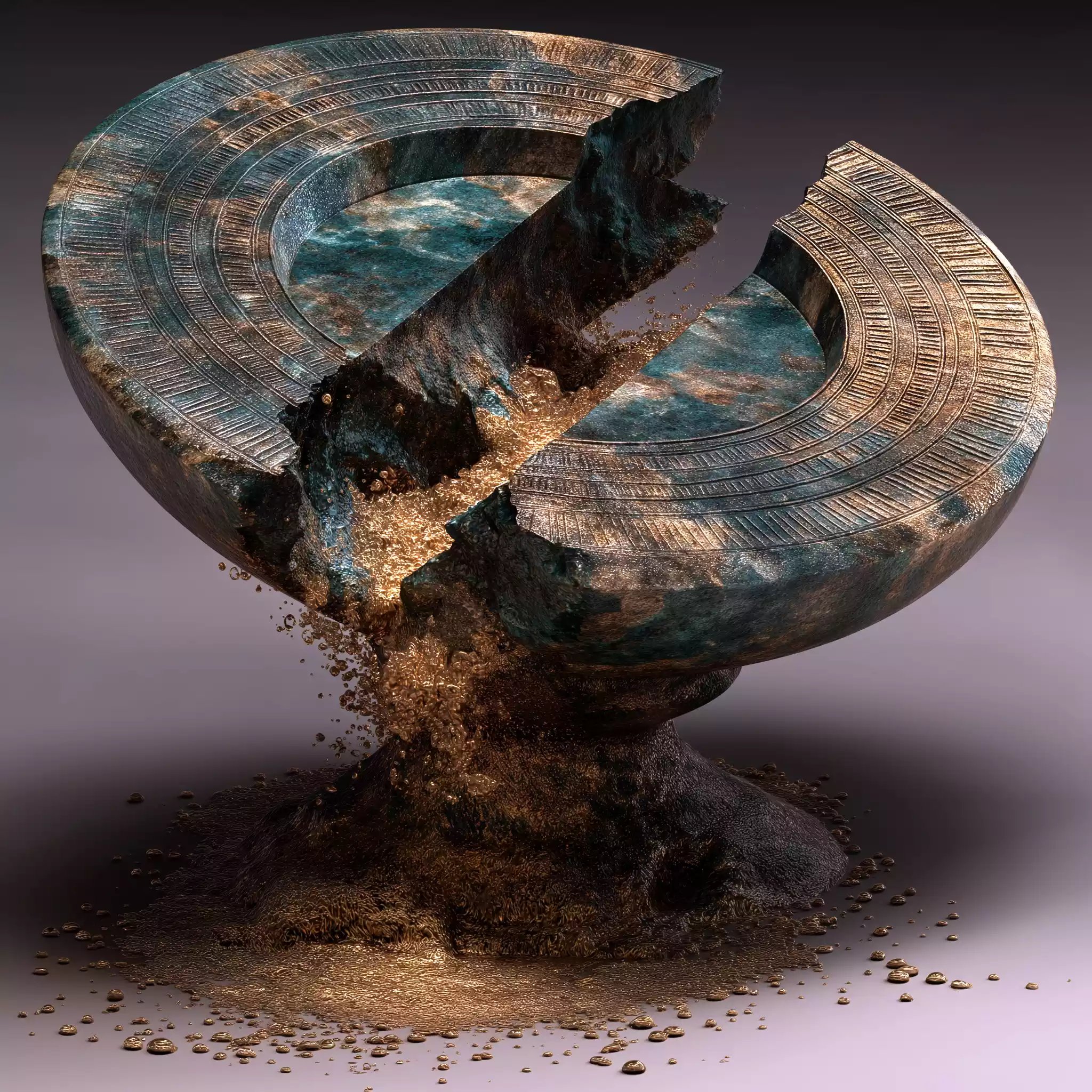 描述:《时间法典:日晷的悖论》,以公元前 3500 年 – 公元前 539 年两河流域天文计时与文明叙事为背景,青铜日晷(古两河流域计时工具)的阴影切割着楔形时辰符,被切割的符号分裂为农耕文明与战争文明两条双生时间线。晷盘裂缝中渗出沙漏粒子流,将计时工具与时间分支、文明形态结合,诠释该时期文明发展中 “时间与选择” 的悖论内涵。