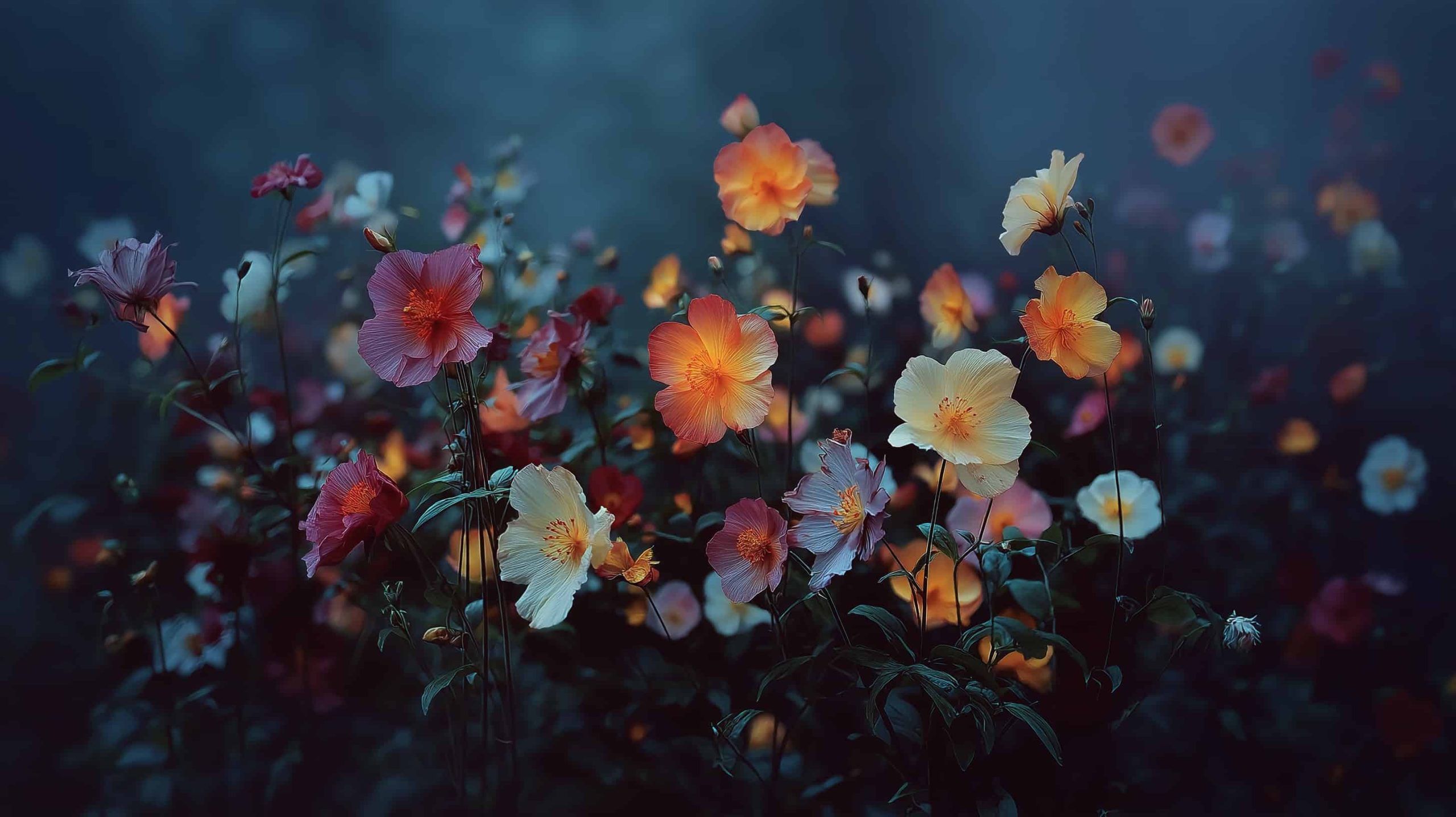 描述:,画面中粉、橙、白等色彩的花卉在暗调背景下绽放,部分花朵朦胧虚化,整体氛围梦幻艺术,传递自然生机与唯美感,适用于艺术海报、背景装饰等场景。