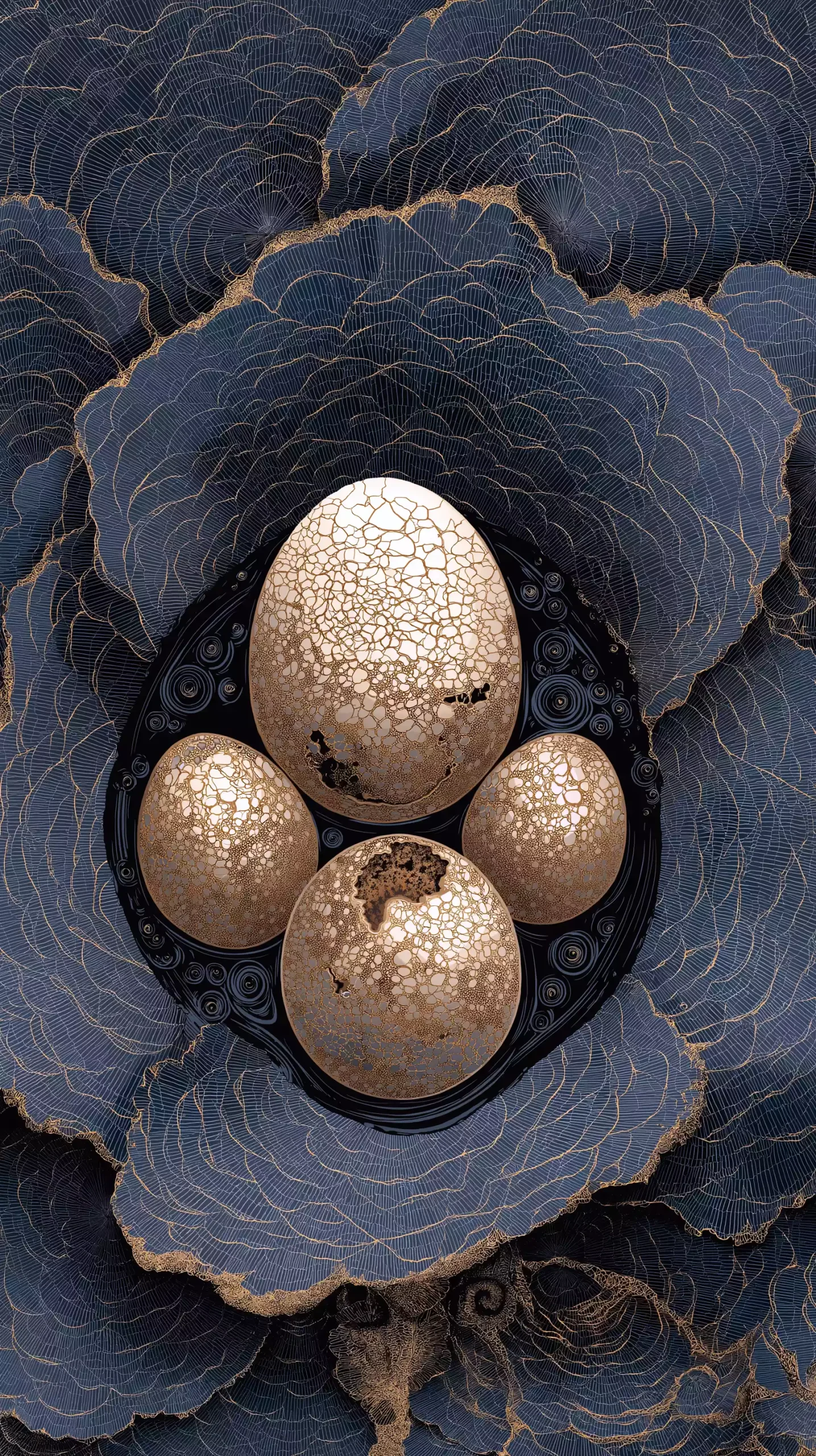 描述:《梵天金卵裂变》,以印度教创世神梵天 “金卵诞生” 为核心叙事。画面中,镀金蛋壳在莲座上龟裂(莲座是梵天的标志性坐骑,象征纯净与新生),裂缝中生长出梵天四张面孔虚影(梵天四张脸分别望向四方,象征掌控宇宙秩序),蛋液蒸发形成娑婆世界投影(娑婆世界即现实宇宙,是梵天的创造成果),蛋黄位置悬浮宇宙钟摆(象征梵天掌控的时间与因果秩序)。通过金卵裂变的动态,诠释印度教 “梵天破卵创世界” 的创世神话。