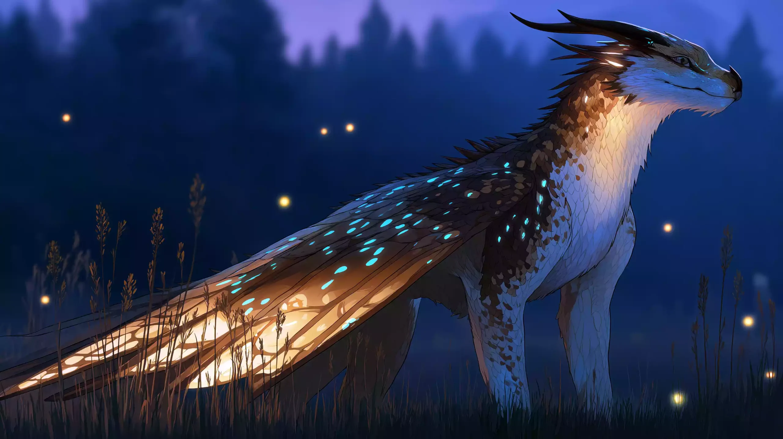 描述:《森林的神性灵物》,公元前 3000 年 – 公元前 8 世纪两河流域多神崇拜背景下,夜晚森林里伫立着带鳞羽、周身泛蓝金光泽的奇幻生物,羽翼与皮毛间闪烁星子般光点,周围飞舞萤火似的微光,背景是蓝紫渐变的森林剪影。这类灵物可视为自然神祇的化身,呼应多神崇拜中 “神寄于自然” 的思维,承载先民对森林、光影等自然现象 “神性化解释” 的文化内涵,体现当时 “解释世界” 的神话功能。