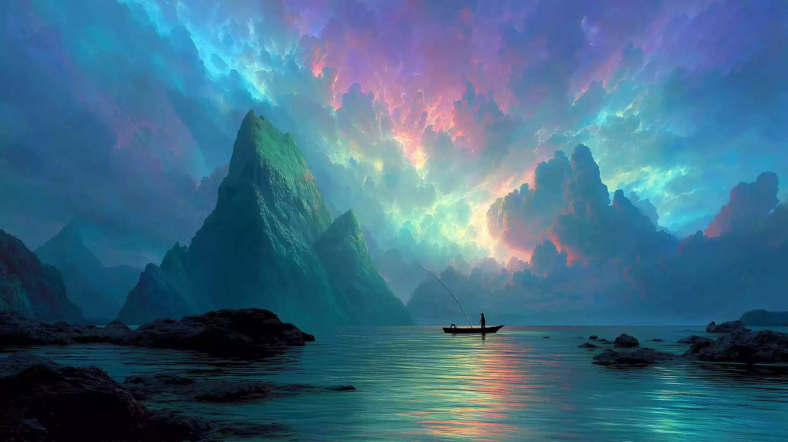描述:《毛伊钓岛链》,源自毛利神话 “毛伊钓岛” 的经典传说 —— 半神毛伊用祖母的发辫作鱼线、下颚骨作鱼钩,从海中钓起新西兰北岛等岛屿。画面中,发光鱼钩拽起海底火山群(火山岛是太平洋岛屿的典型形态,还原 “钓起陆地” 的神话场景),鱼线由七彩彩虹构成(彩虹在毛利文化中象征神与人间的桥梁),钩尖滴落的岩浆冷却成温泉(温泉是新西兰特色地貌,体现 “神性力量转化为自然景观”),鱼饵处旋转着翡翠护身符(翡翠是毛利人的圣物,护身符象征祈福与守护),诠释毛伊 “改造自然、造福族群” 的英雄形象。