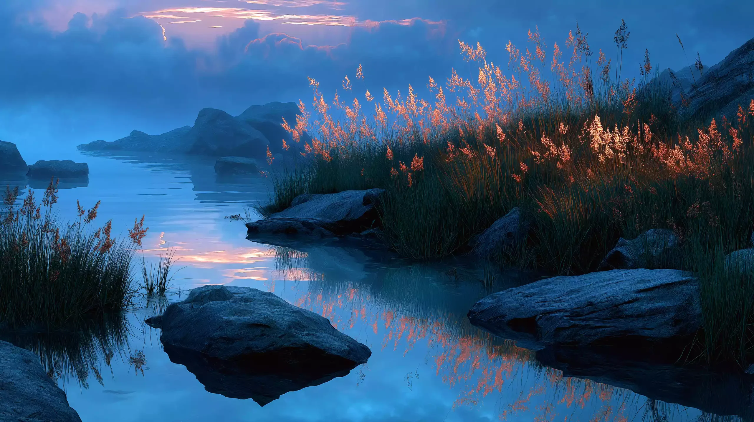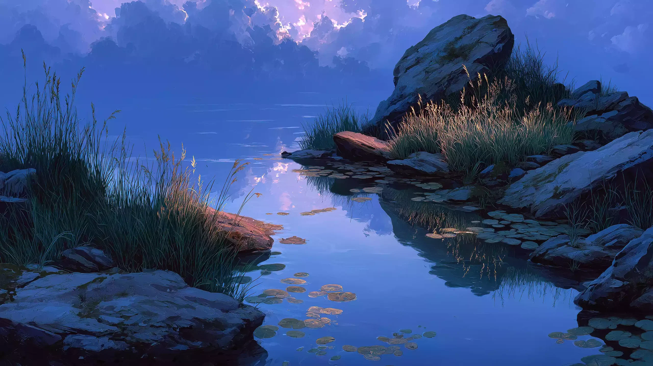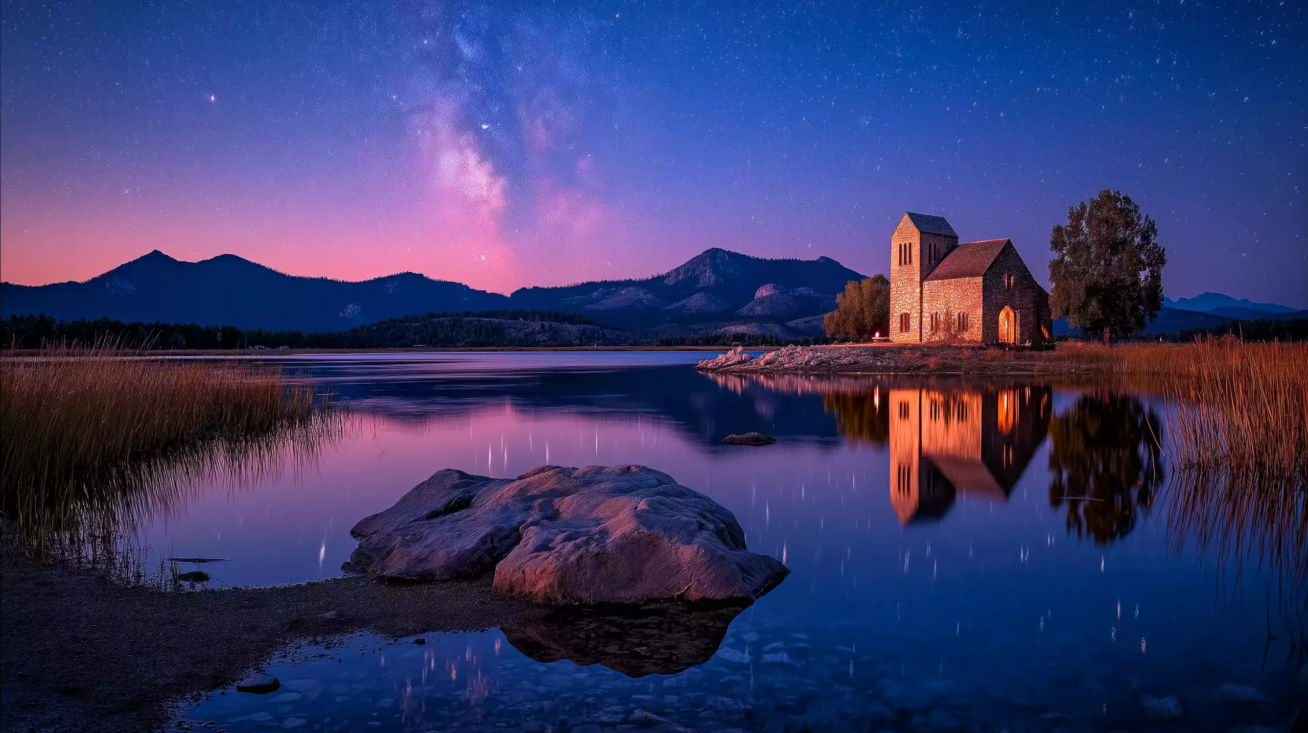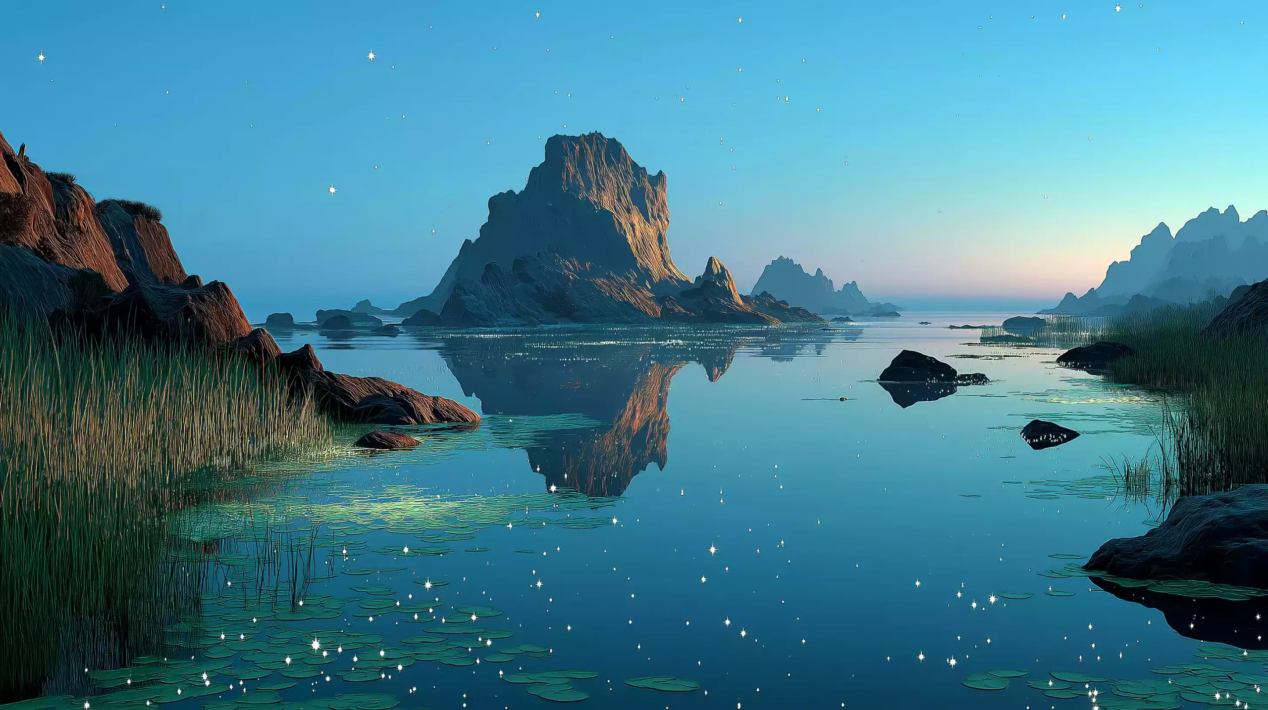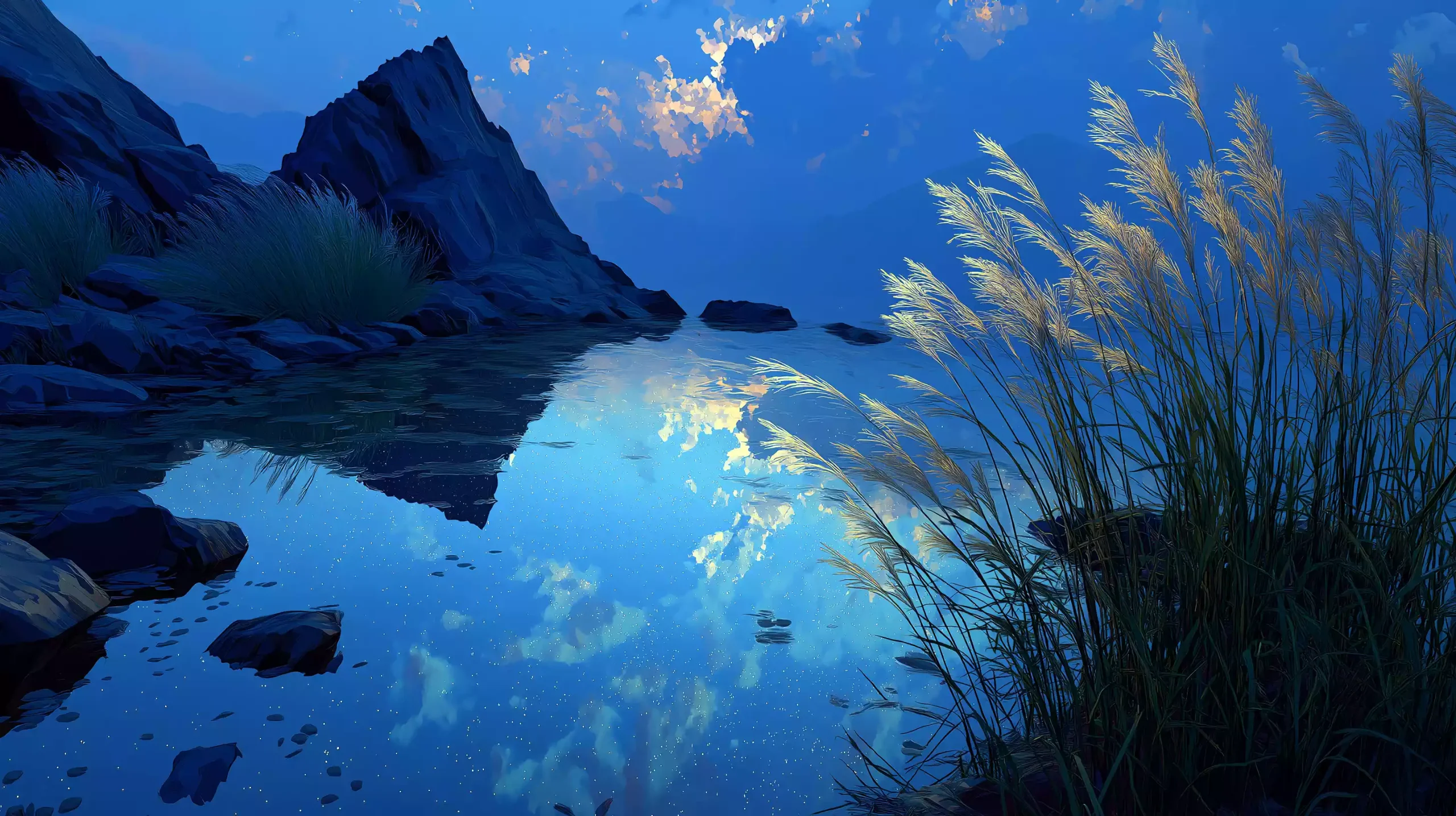 描述:《永生的倒影》,公元前 3000 年 – 公元前 8 世纪两河流域《吉尔伽美什史诗》永生母题背景下,湖面倒映扭曲星空,星点化作发光水草,叶片刻楔形文字(永生秘密)。湖中央半沉岩石光滑,反射天与水双重影像,似现实与永生的交界。湖边芦苇剪影随风晃动,画面静谧神秘,呼应英雄追寻永生的终极命题。