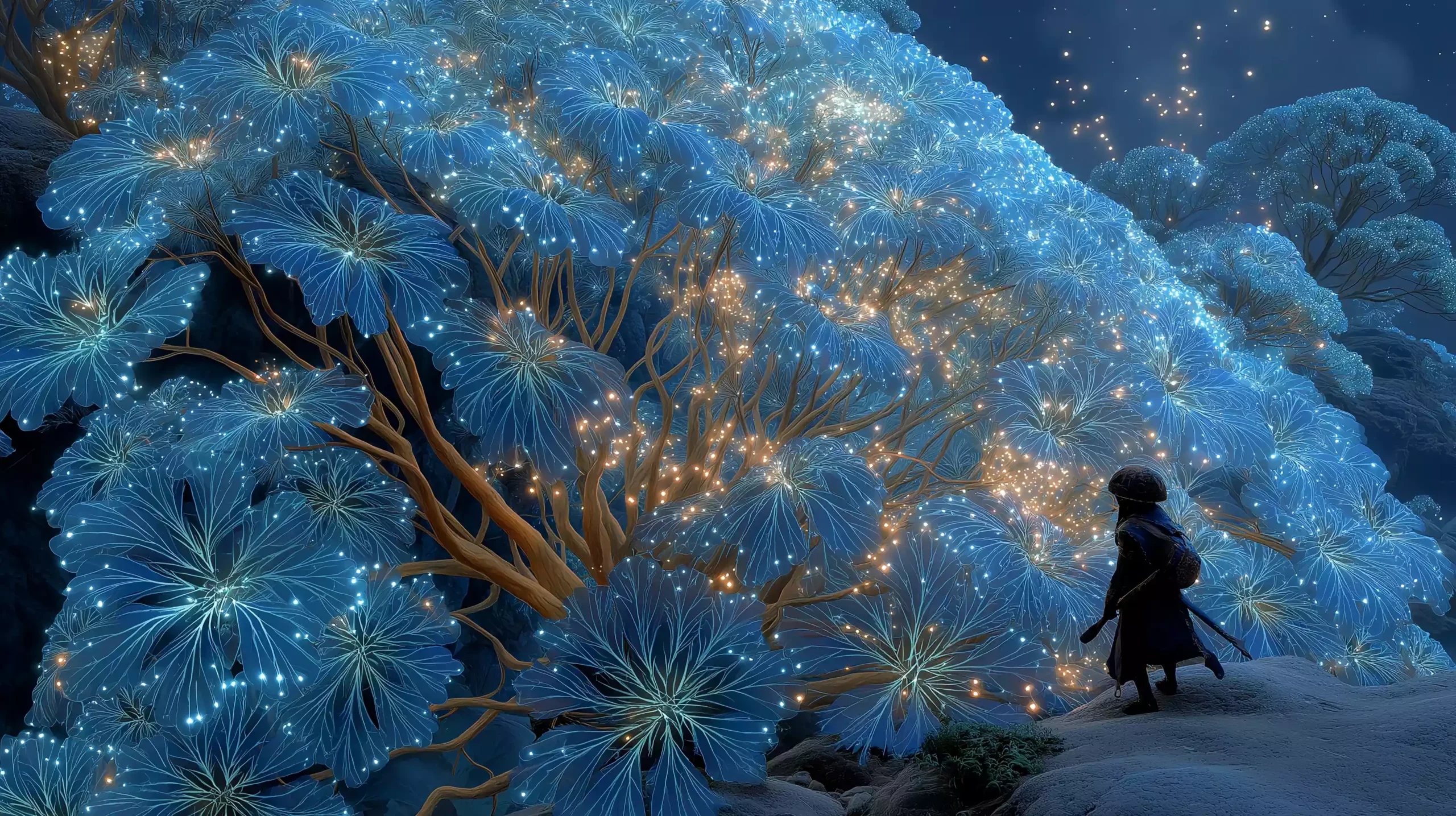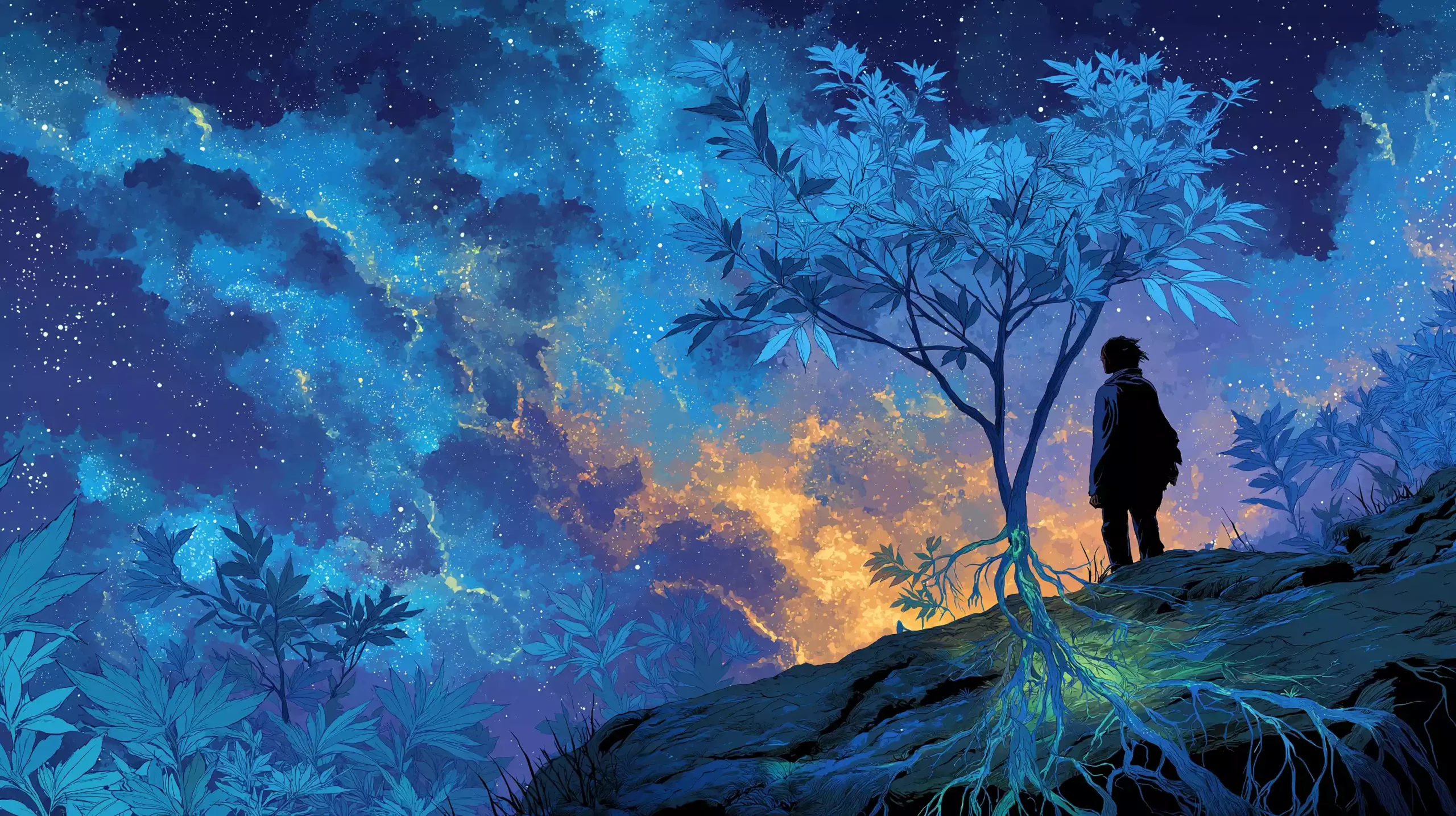 描述:《永生草的光合圣歌》,依托公元前 3500 年 – 公元前 539 年两河流域《吉尔伽美什史诗》背景,发光植物叶片布满《吉尔伽美什》文本光纹,根系深扎水晶地脉。光尘从叶片升腾,聚合成英雄虚影,背景星云旋涡中暗藏楔形文字符号。以 “光合圣歌” 为意象核心,将永生草、史诗文本与英雄符号结合,传递该时期追寻永生的史诗叙事与神性光辉。