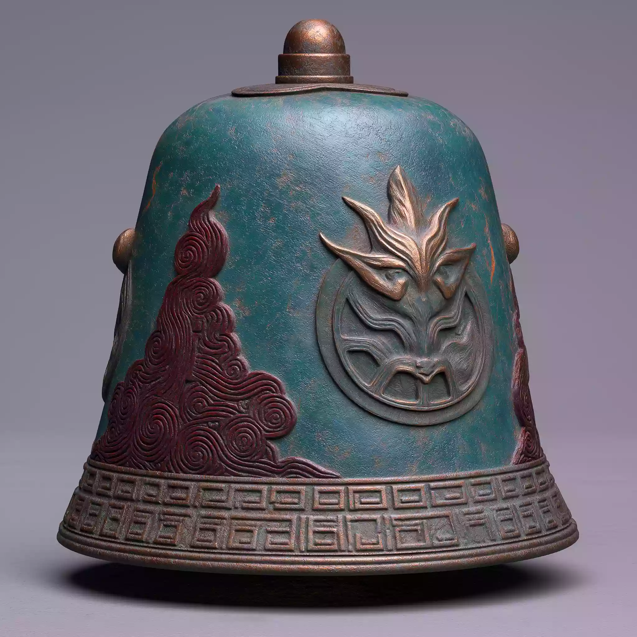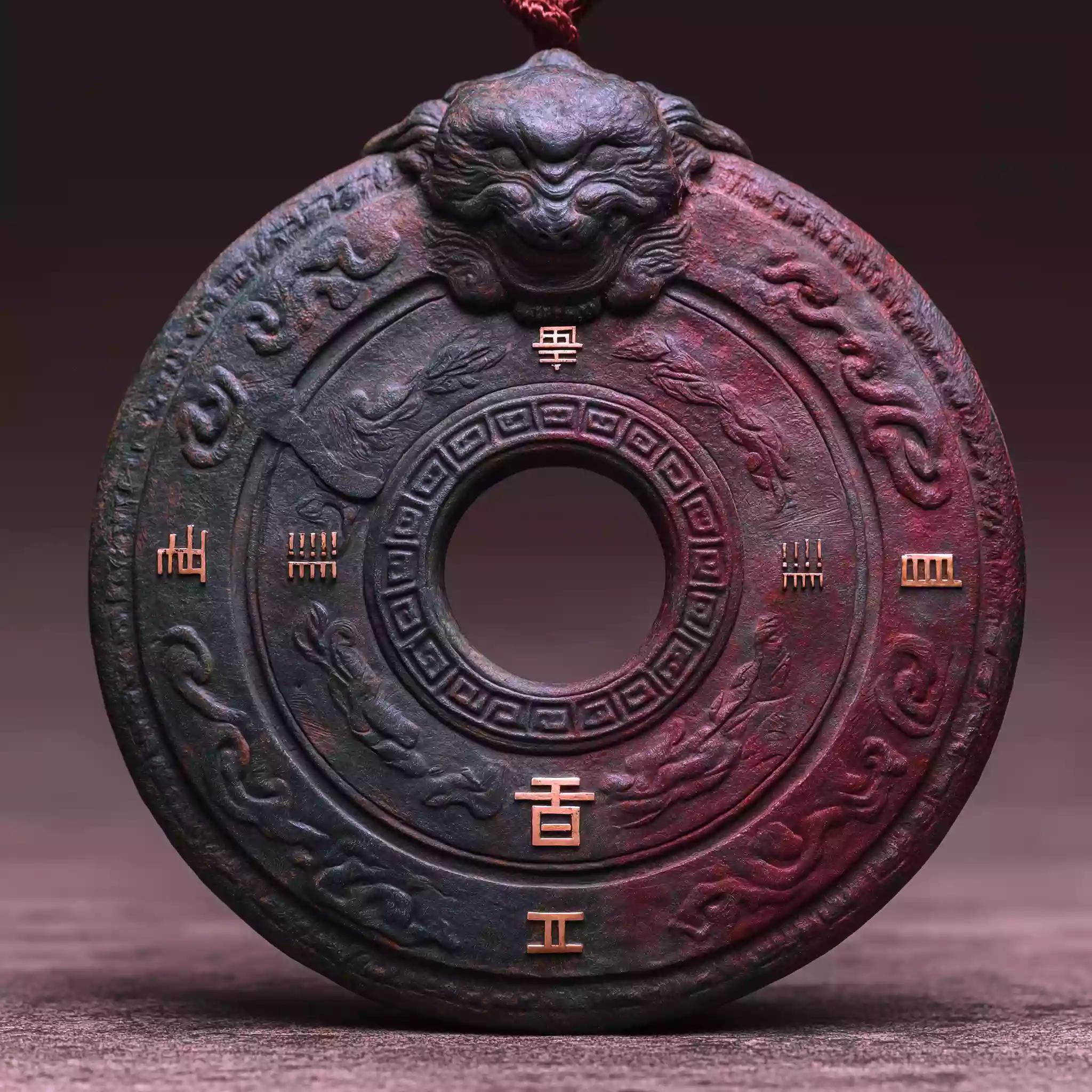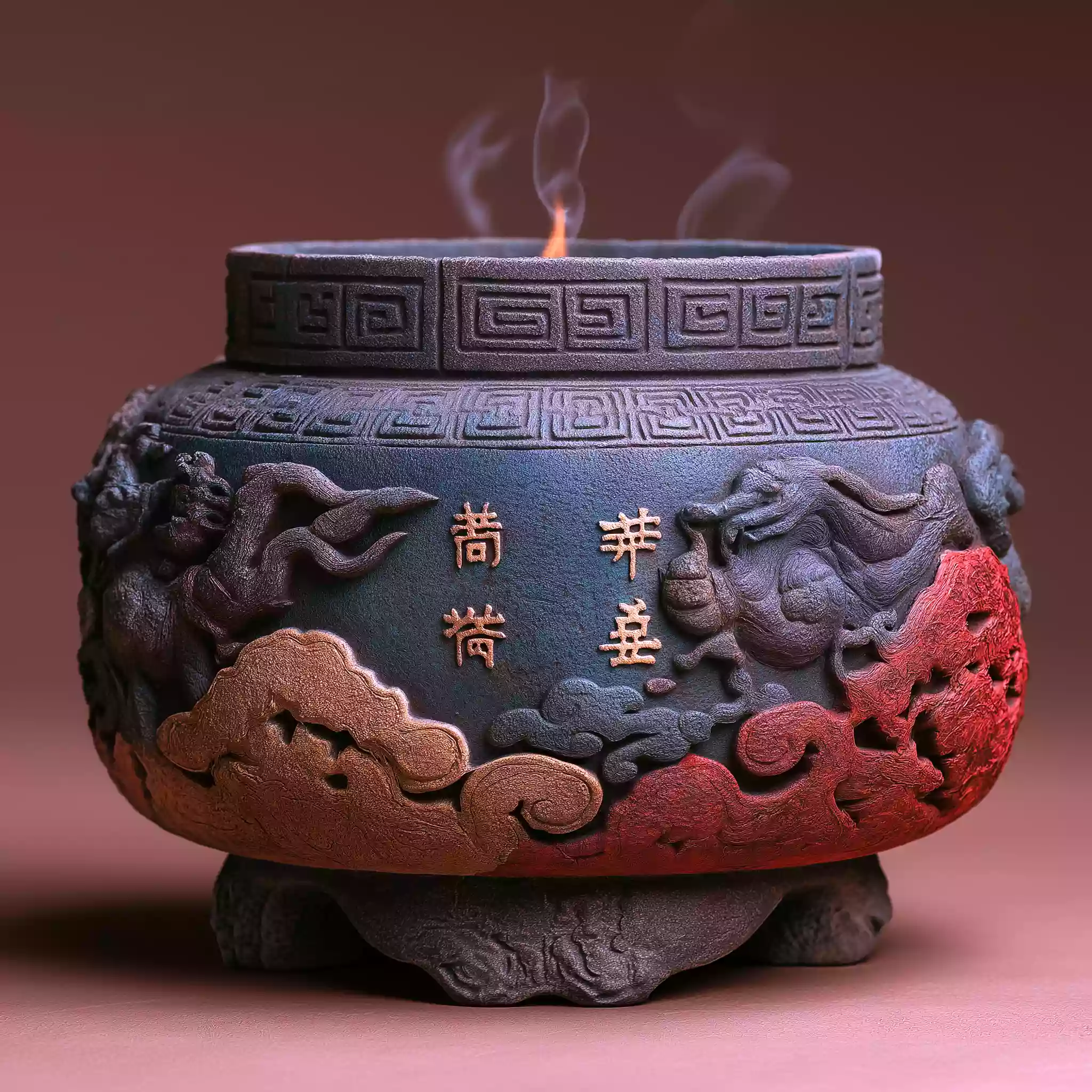 描述:《天命转移・汤武革命》,关联秦汉 “天命转移” 政治观(承商周汤武革命逻辑)。画面特写青铜鼎,鼎身覆绿锈、刻饕餮纹,一面线刻火焰战旗、一面刻雷电战车;上方暗红衰亡云气(夹甲骨碎片)与明黄祥瑞云气交汇,成彩虹光桥,象征权力更迭,侧光凸显纹饰立体与云气流动,显 “天命归有德” 内涵。