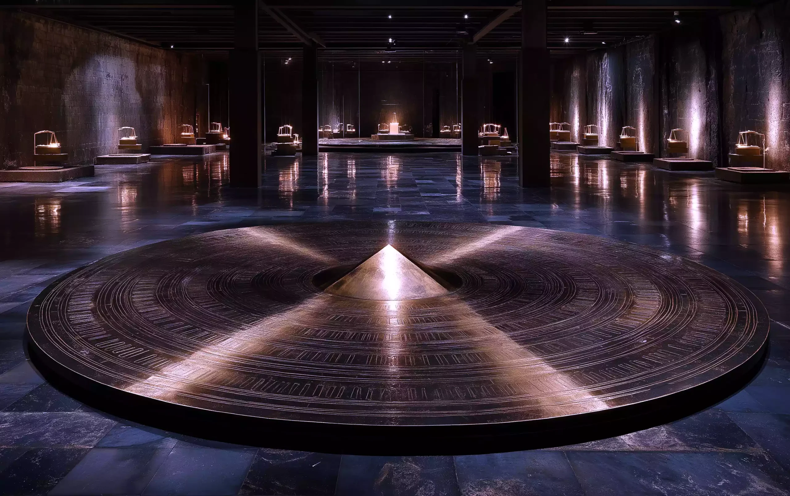 描述:《沙玛什的律法光锥》,以两河流域 “古原初之渊:阿普苏的沉眠” 神话为背景,青铜日轮放射出十二道光锥,象征太阳神沙玛什所掌管的十二时辰与律法秩序。每道光锥内都禁锢着微型法庭场景(审判与契约签署),光线折射在空中形成悬浮的正义天平图腾。整体将日轮、光锥、法庭与天平融为一体,诠释沙玛什作为光明、正义与律法之神的核心神性。