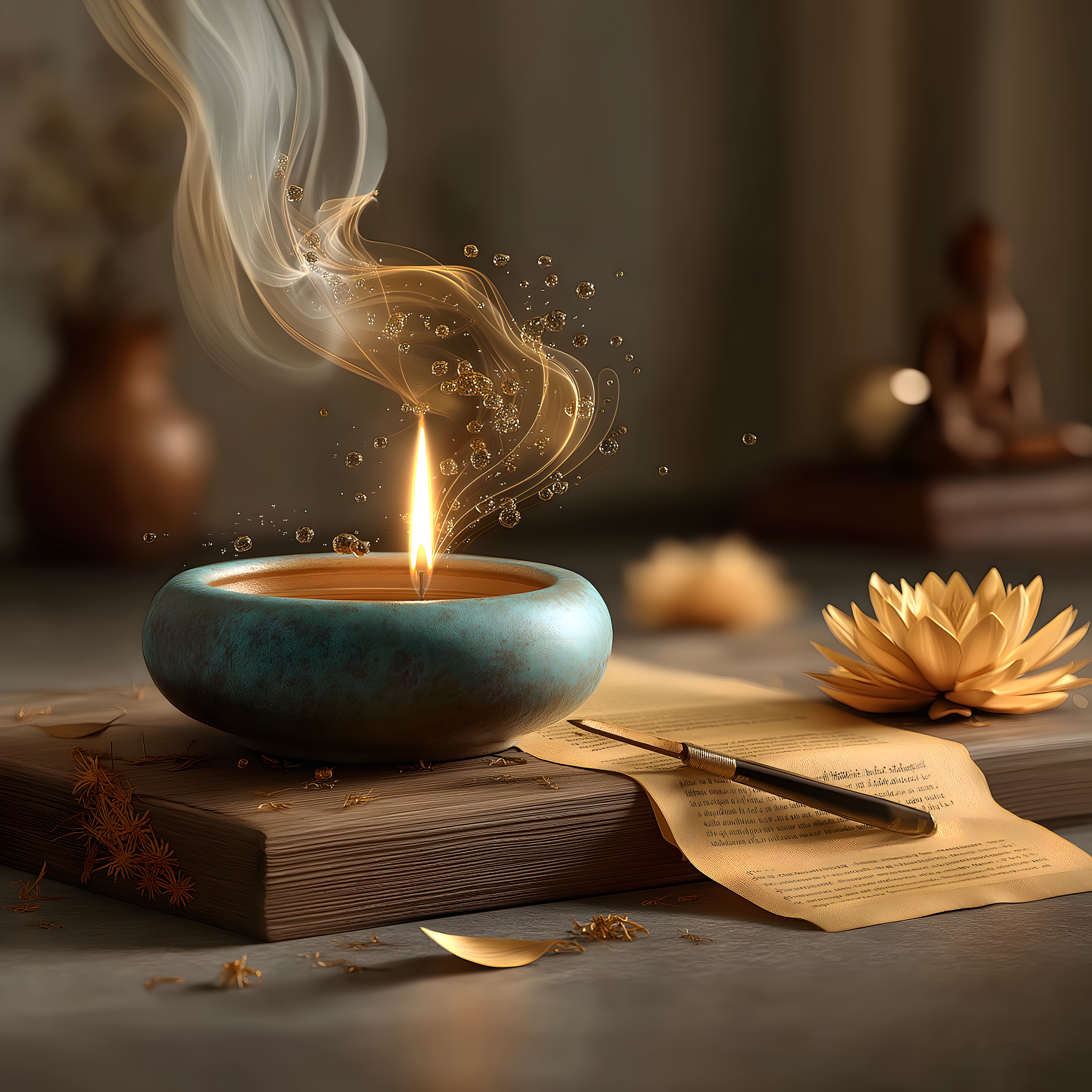 画面描述:木案之上,陶制油灯火焰稳定,莲花粒子环绕。经卷、铁笔点缀,纱帘后佛龛隐约,“护”字粒子随火焰闪烁。柔光凸显油灯长明的静谧,诠释护法的虔诚与佛法的永恒守护。