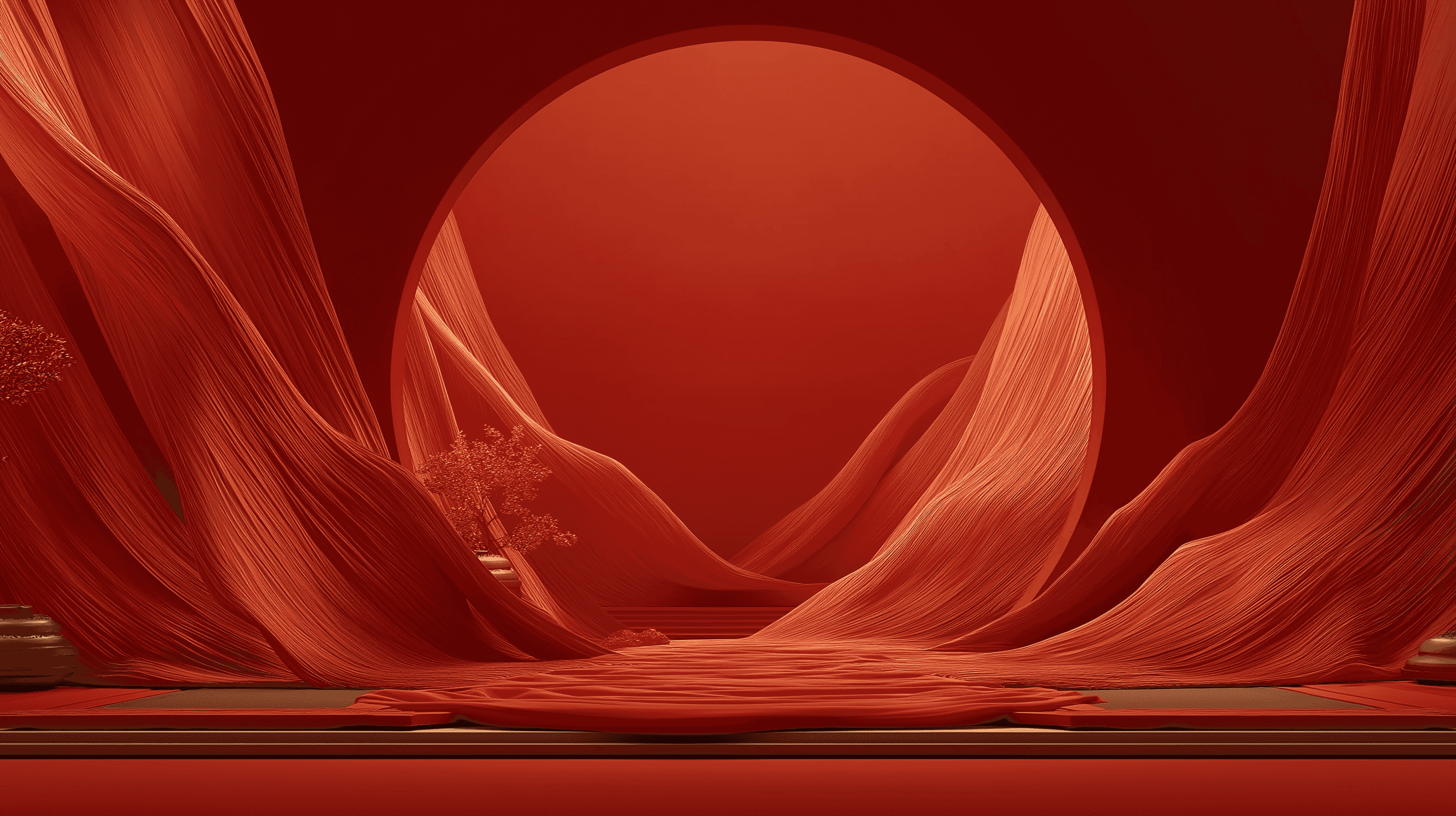 描述:呈现新中式风格画面,大面积红色绸缎质感的曲线元素环绕,中间圆形门洞营造空间感,搭配盆栽等东方元素,整体氛围喜庆雅致,适用于国风广告、传统节日宣传、中式产品展示等商用场景。