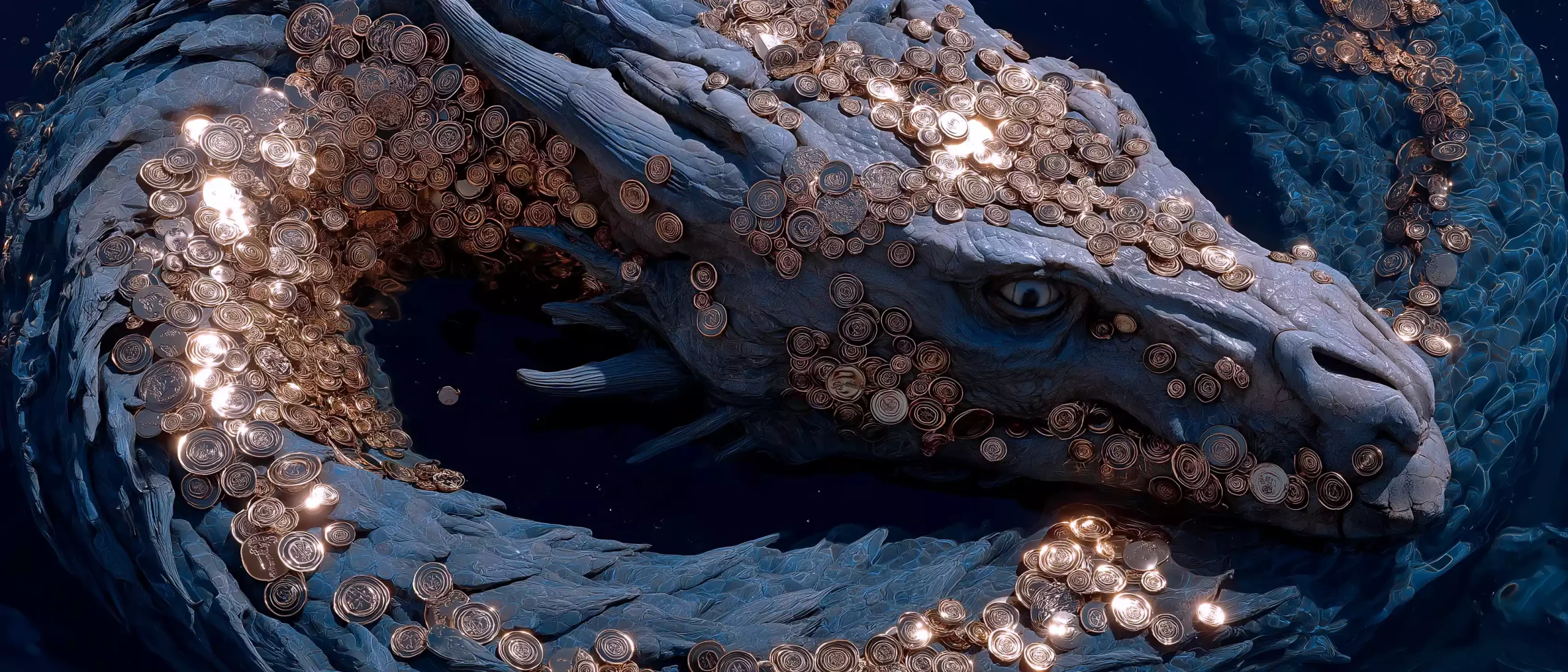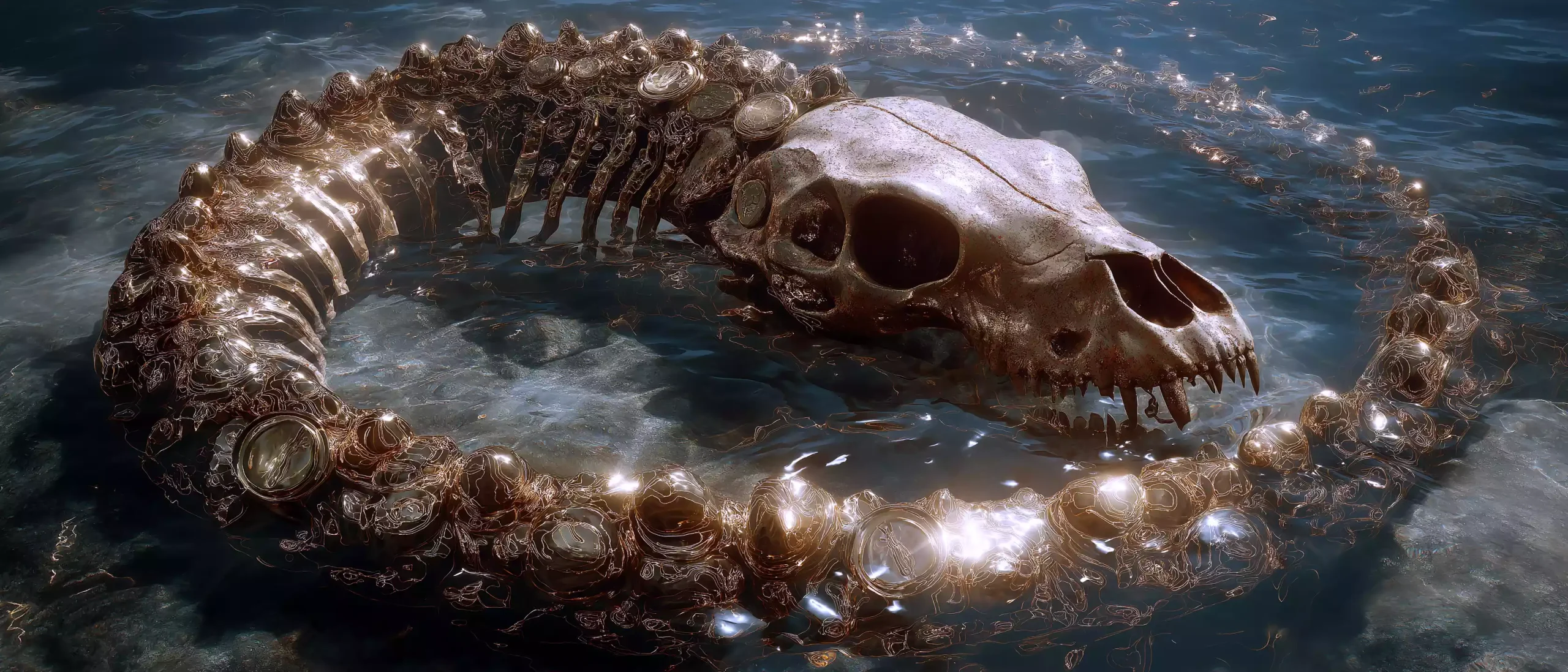 描述:《法夫纳黄金癌》,以北欧维京时代(约公元 8 世纪 – 11 世纪)北欧神话为背景,聚焦巨龙法夫纳的贪婪诅咒。巨龙骸骨盘踞莱茵河底,脊椎镶嵌着带诅咒的金环,环内的尼伯龙根指环增殖成区块链状的 “黄金肿瘤”,河水源流被染成象征财富的血液色。将法夫纳因贪婪变龙的传说与 “黄金增殖” 意象结合,诠释北欧神话中 “贪婪即诅咒” 的内核。