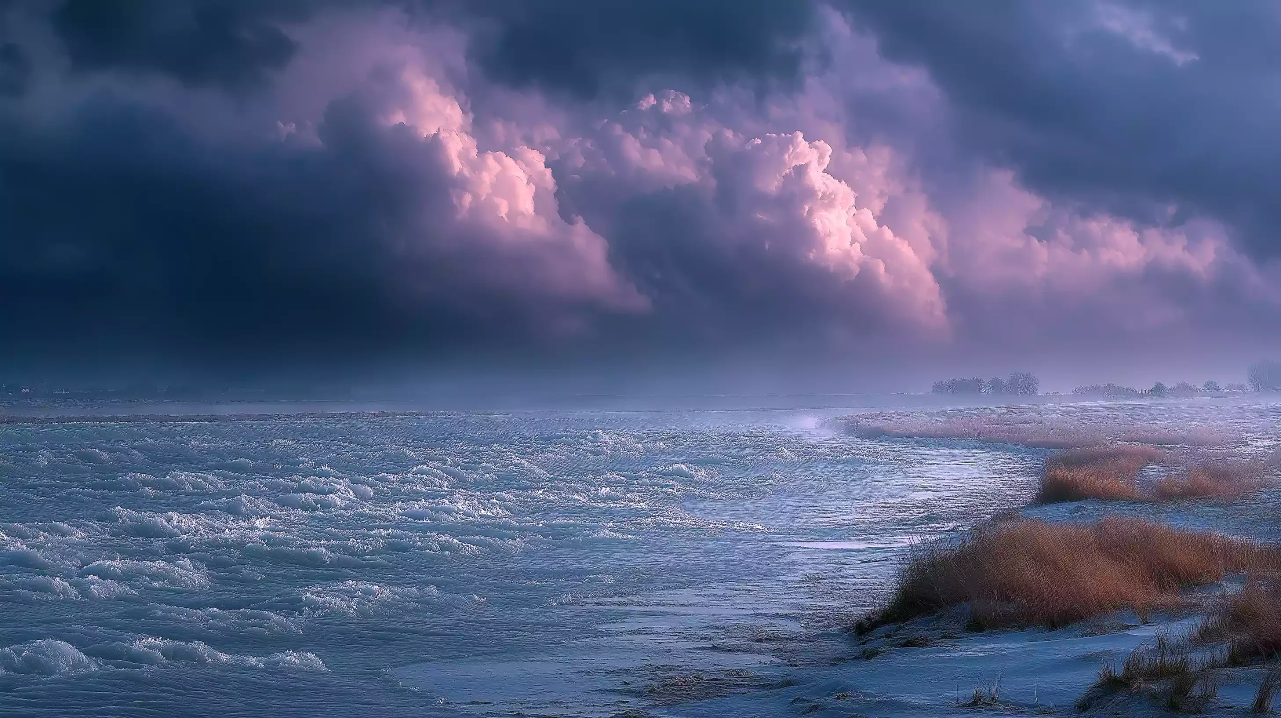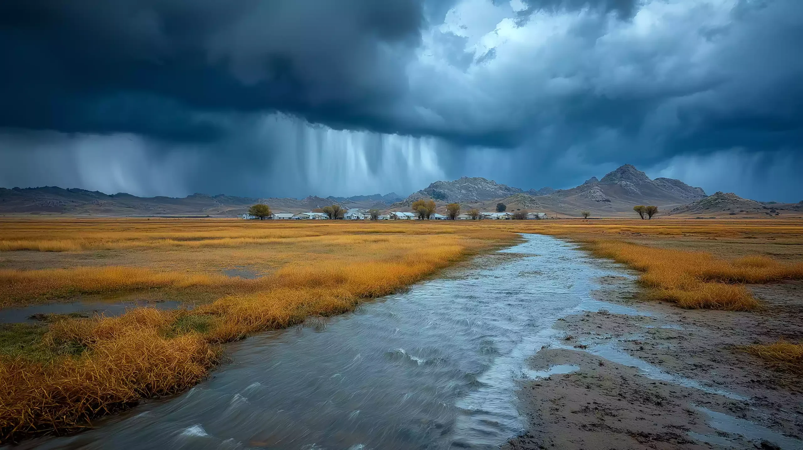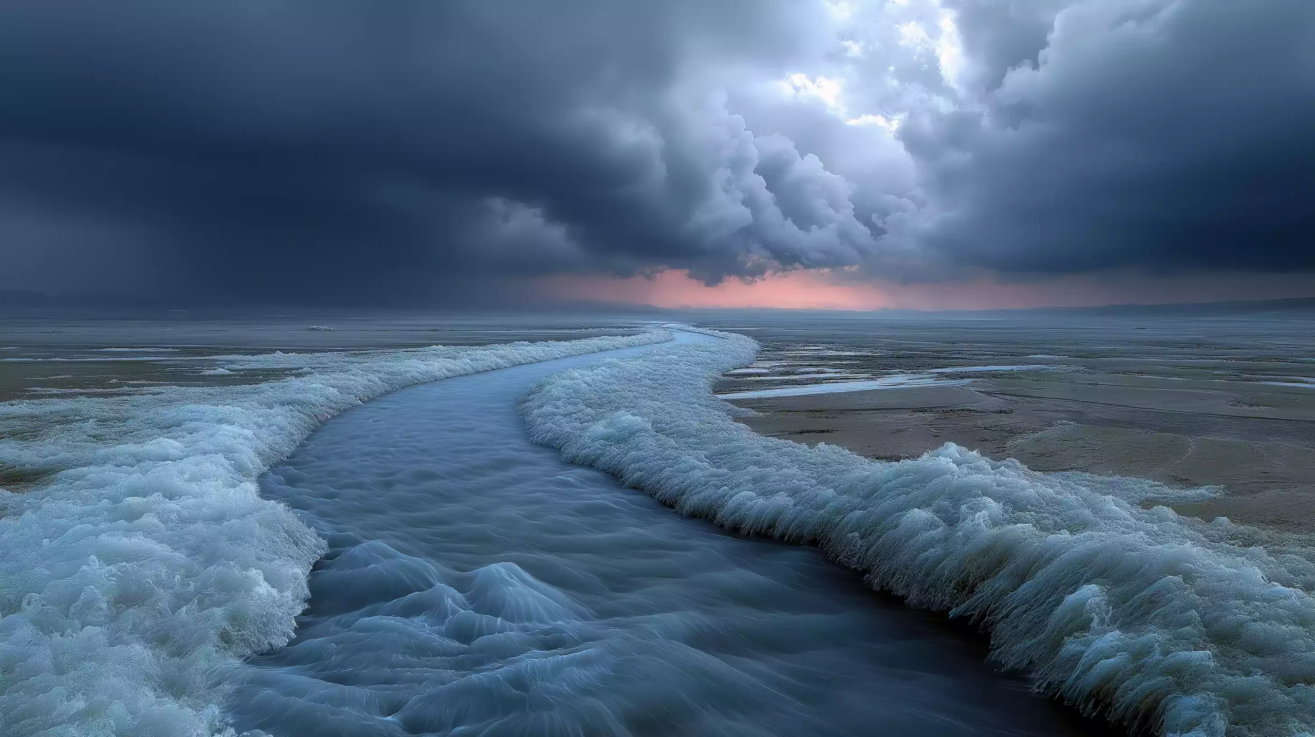 描述:《洪水前兆》,铅灰色云层低垂,密集银线雨丝如帘,雨丝中旋绕水涡,涡内隐现芦苇丛轮廓(苏美尔湿地特征)。下方浑浊水流扇形漫延,漂浮编织物碎片,水流边缘冲刷着楔形文字,似遗忘的祷文。天际线一道暗紫色裂缝划破苍穹,暗示灭世灾难源头。画面阴郁压抑,呼应《吉尔伽美什史诗》洪水母题。