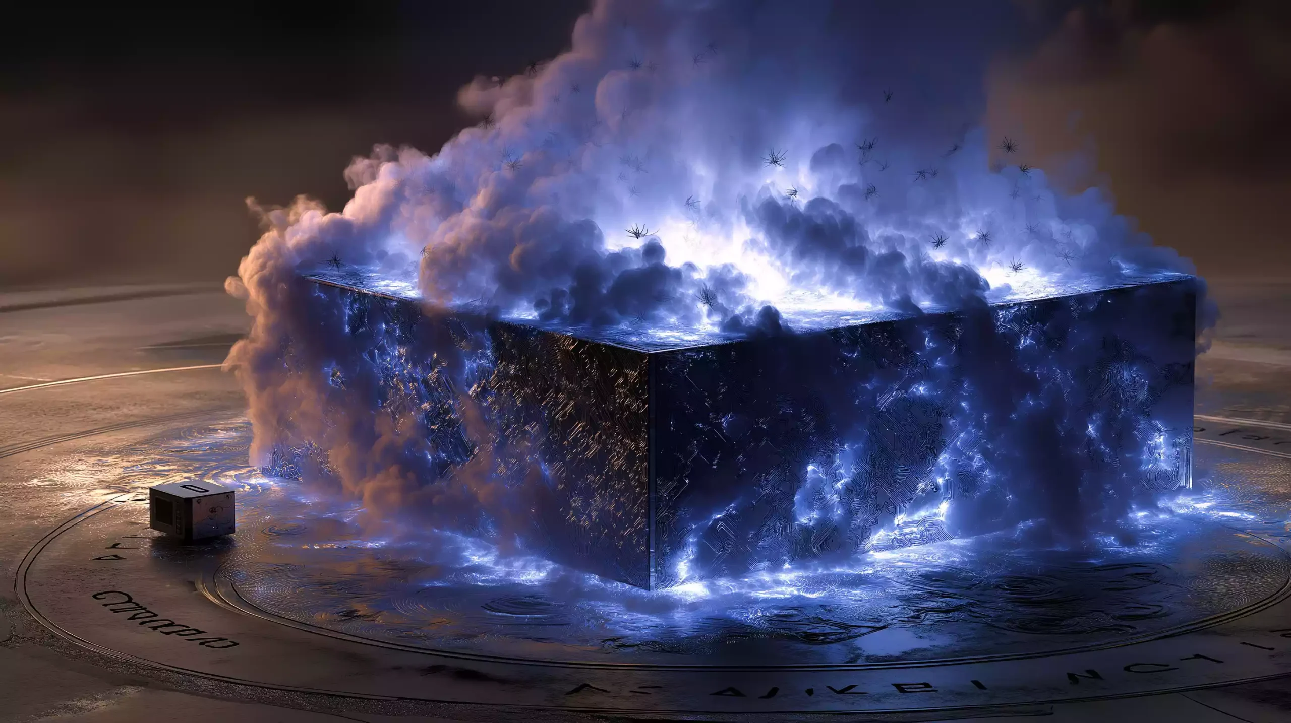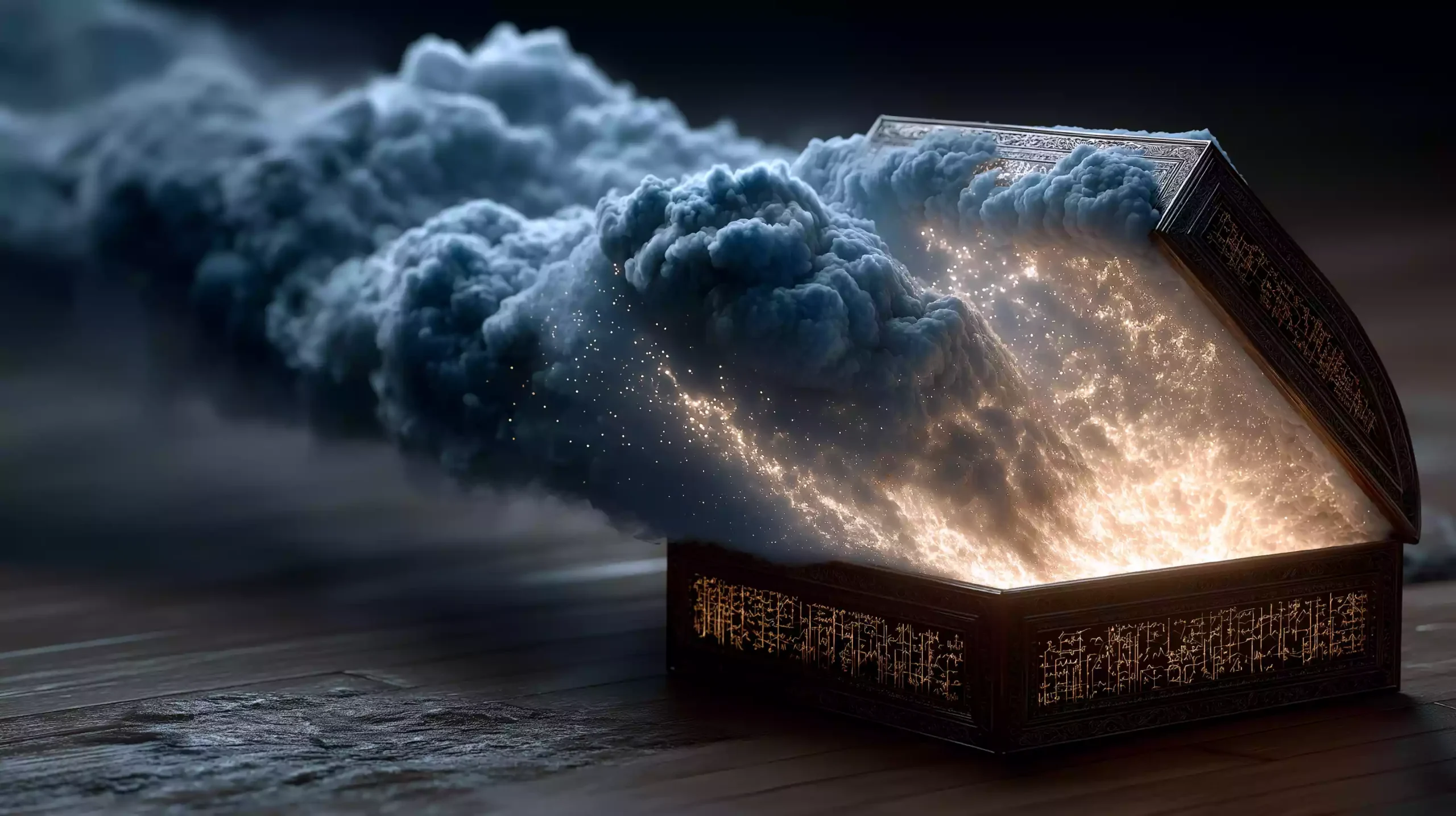 描述:《潘多拉云灾盒》,以希腊神话潘多拉为原型,融合现代数据时代语境,开启的魔盒释放比特洪流,盒内飞出加密劫持病毒 —— 魔盒呼应 “灾难之源”,比特流象征现代数据风险。盒底希望芯片微光闪烁,盒盖投影防火墙卢恩符文。画面将古典神话与科技危机结合,诠释 “灾难与希望并存” 的永恒主题。