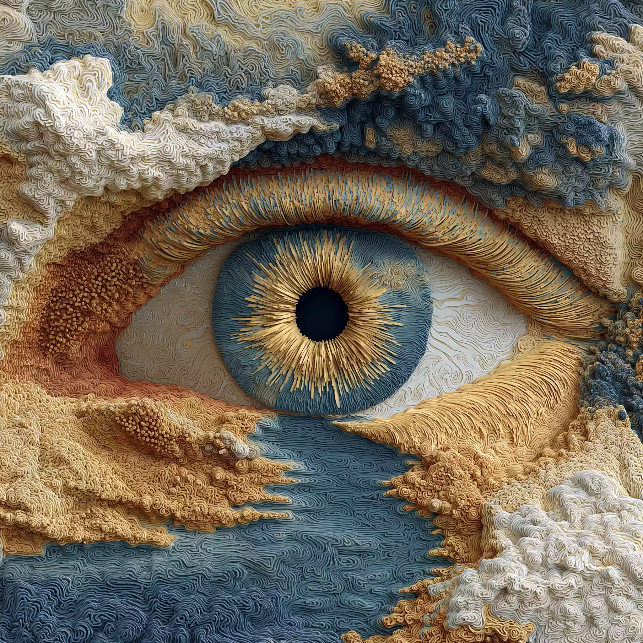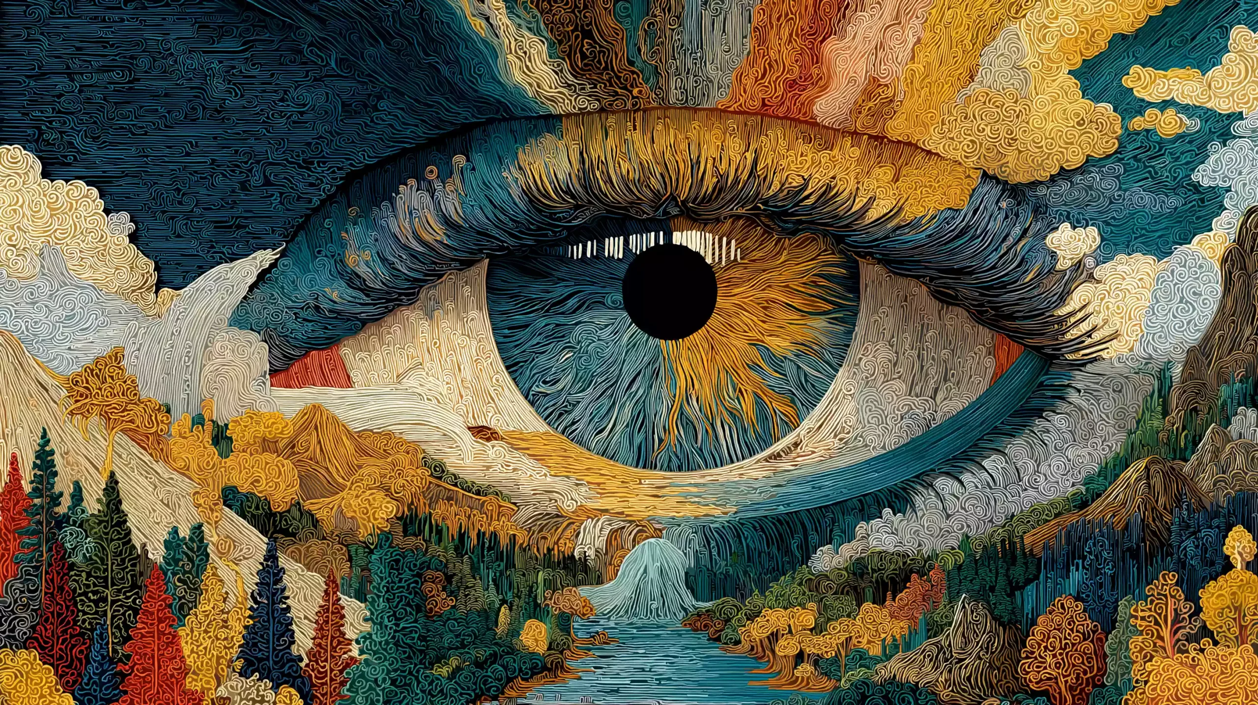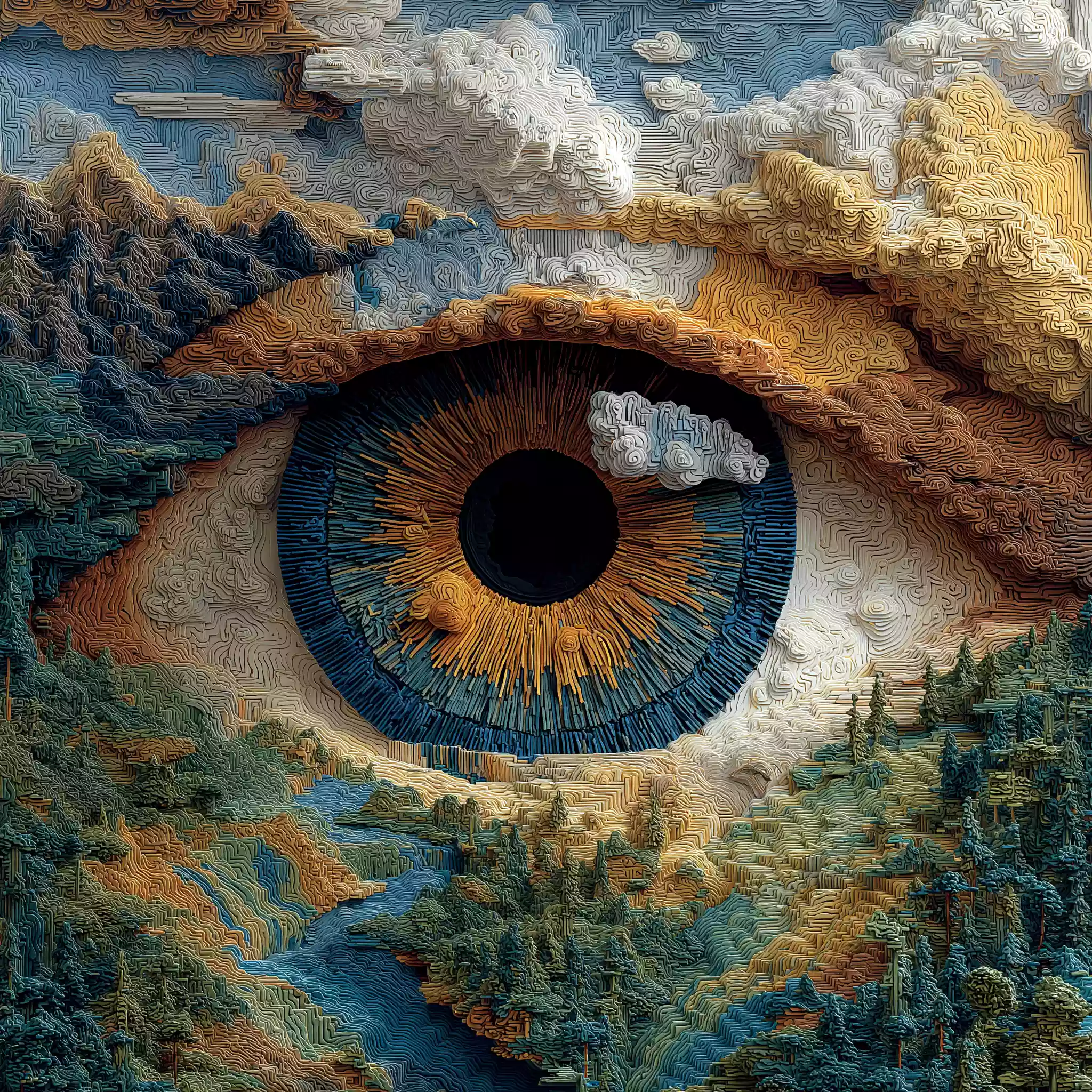 描述:《烛龙目启暝》,以中国神话中 “烛龙睁眼为昼、闭眼为夜” 的核心设定为魂。画面中,宇宙深处悬着山脉般的巨型瞳孔(烛龙神性的具象化),虹膜纹路天然化作长江黄河(暗合烛龙与华夏大地的联结);瞳孔收缩时释放耀眼白昼光爆(呼应 “睁眼为昼” 的神话能力),周边 “睫毛” 如森林般的星丛间,悬浮着发光的二十四节气刻度盘(将烛龙 “掌控时序” 的力量与传统历法结合),整体诠释烛龙 “定昼夜、序时节、联华夏” 的深层文化内涵。