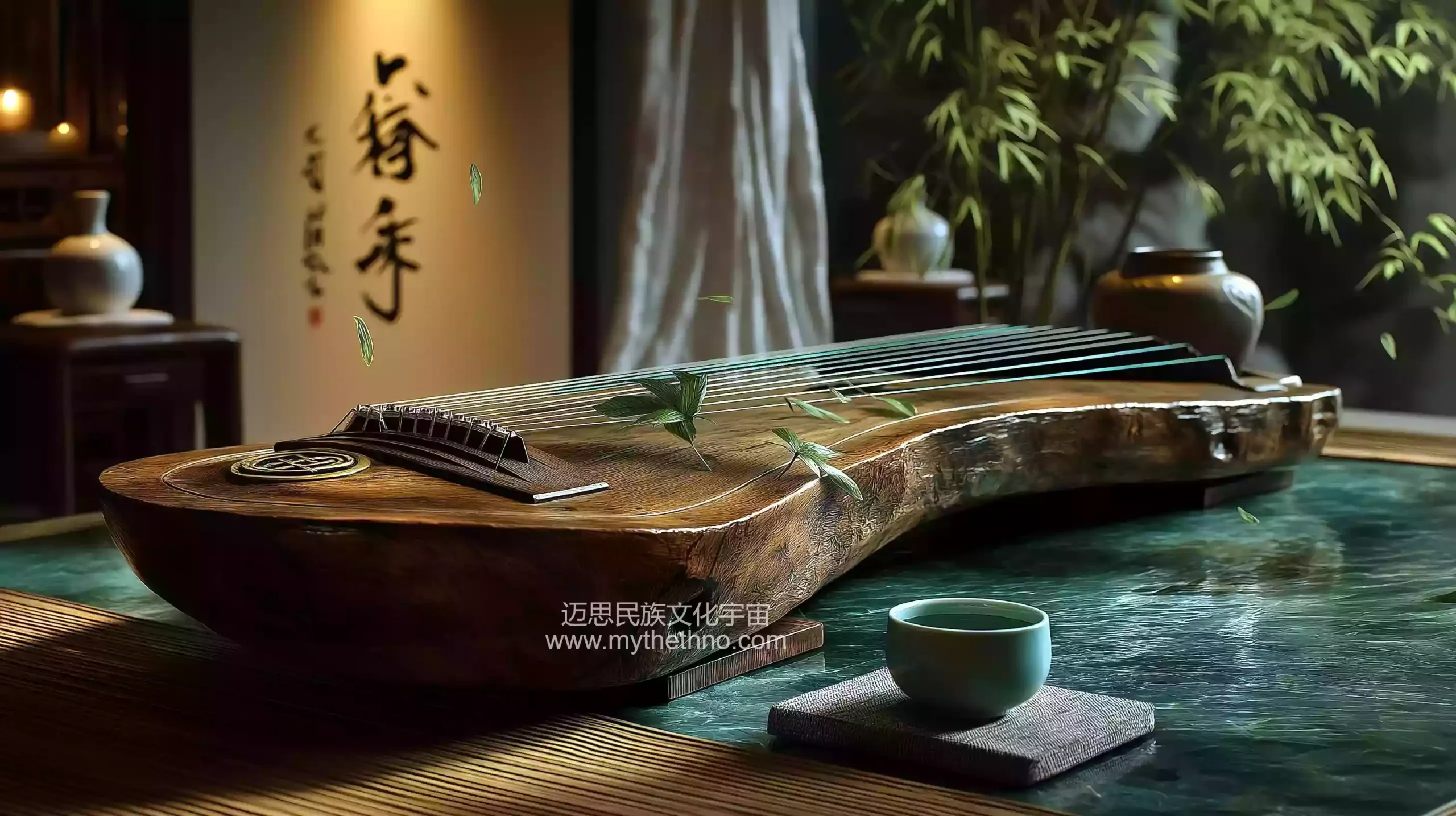 描述:《玄学论道・琴瑟和玄》,反映魏晋 “清谈论玄” 风尚(琴瑟和鸣是玄学交流的雅致载体)。画面以淡棕木案为底(带琴痕),中心半透明七弦琴(银弦光纹)与淡灰瑟;琴瑟间浮淡绿竹叶粒子,案左放打开的竹简(似《老子》),右有淡青瓷杯(盛绿茶,液面生共鸣波纹);背景隐淡白纱帘(后透淡金 “玄” 字虚影),侧光显琴瑟雅致与论道氛围。