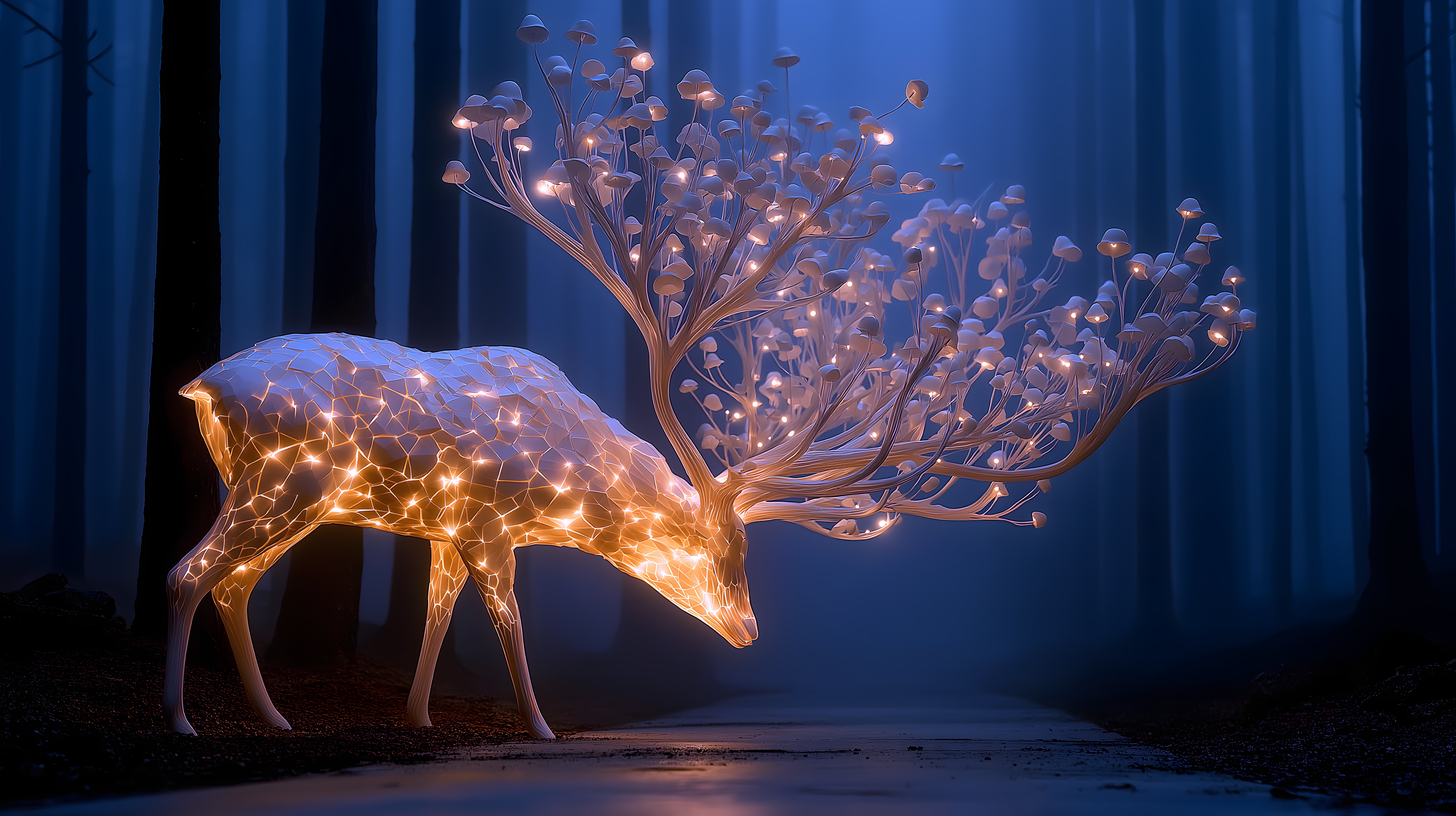 画面描述:以斯拉夫白神驯鹿神话为灵感,硅基与碳酸钙晶体构成发光鹿角林,角尖滴落乳白色矿物胶体汇成河流,枝间悬金属硫化物日月铃,根系缠绕发光古陶碎片,呈现生命与矿物共生的神圣生态。