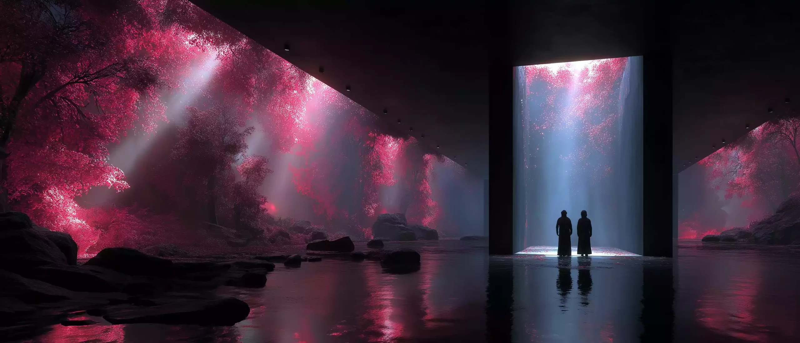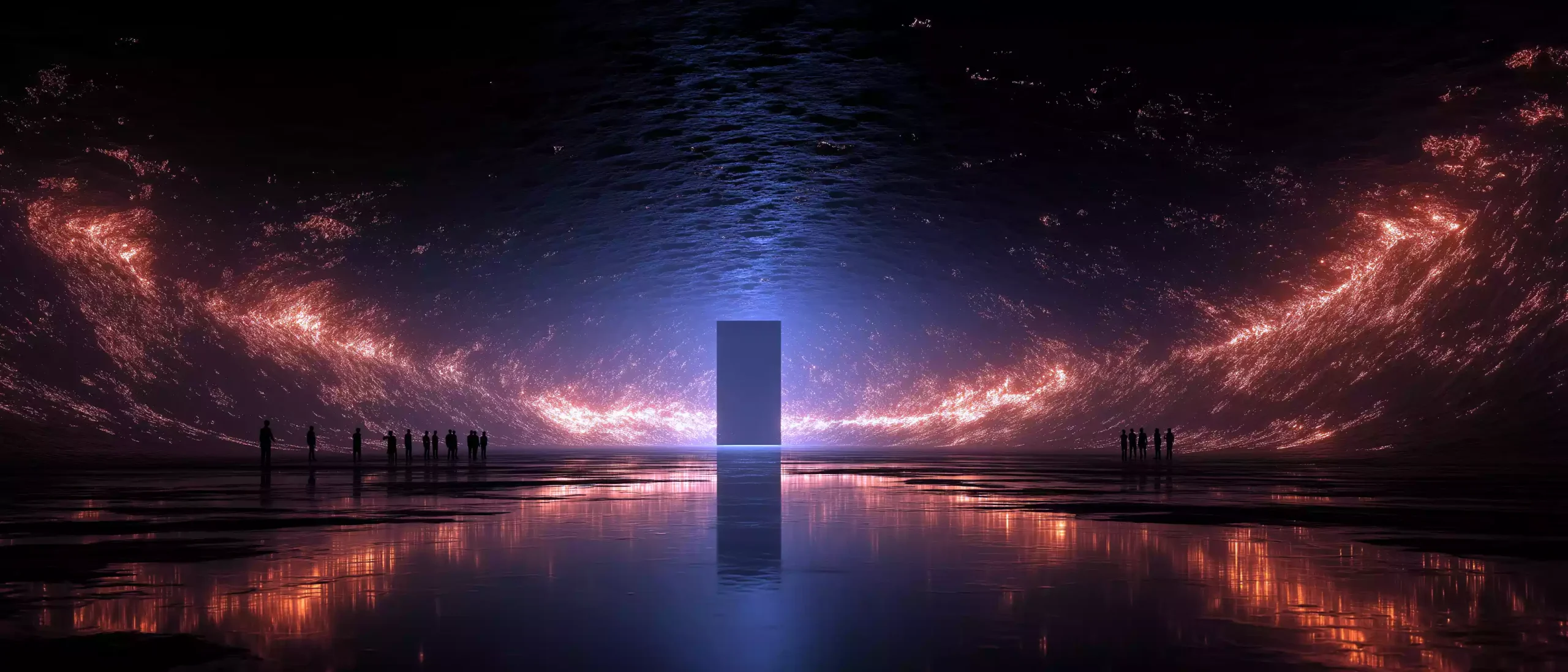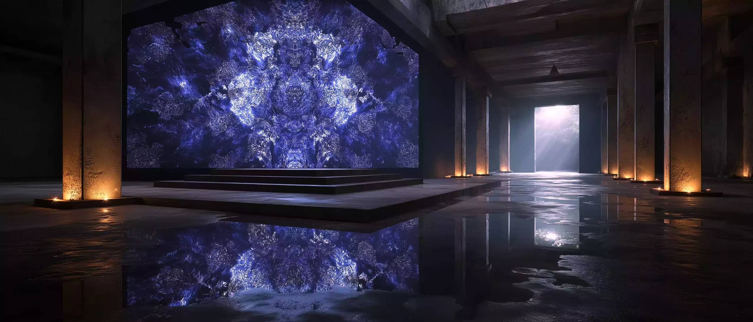 描述:《神话转型终局廊》,以 “神话符号的古今演变” 为核心立意,收官神话主题叙事。画面中,无限镜廊通过层层反射铺展符号演变史:左侧镜面上,古代祭坛的祭祀血逐渐转化为现代商业的商标火(象征神话从宗教祭祀符号变为商业文化符号);右侧镜面里,先民敬畏的神谕具象化为流动的数字数据流(诠释神话从神圣启示演变为信息载体)。镜廊尽头的光门投射出 AI 艺术宣言,将神话的转型推向 “科技重构” 的终局,完整呈现神话从传统到现代再到 AI 时代的文化嬗变。