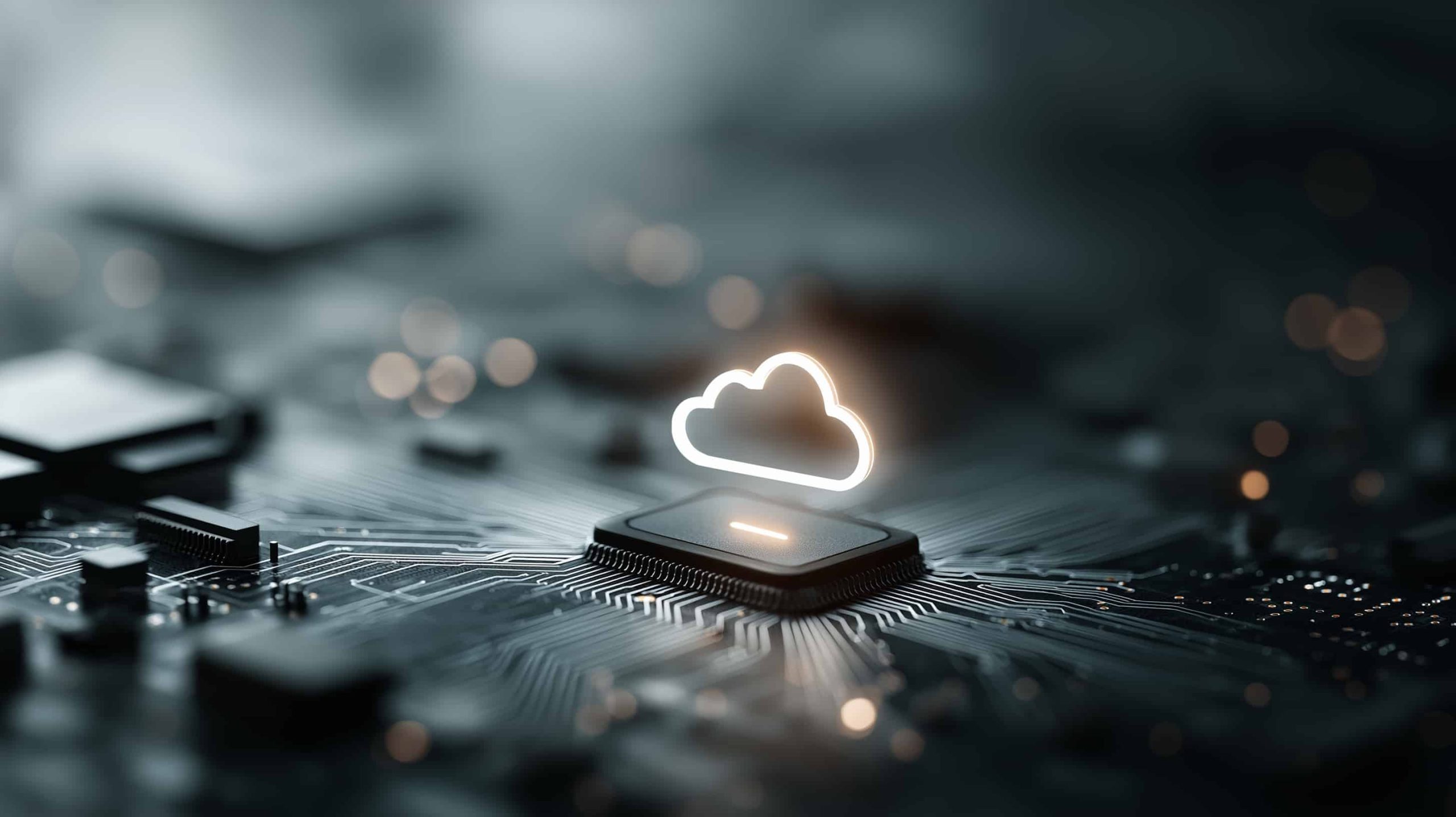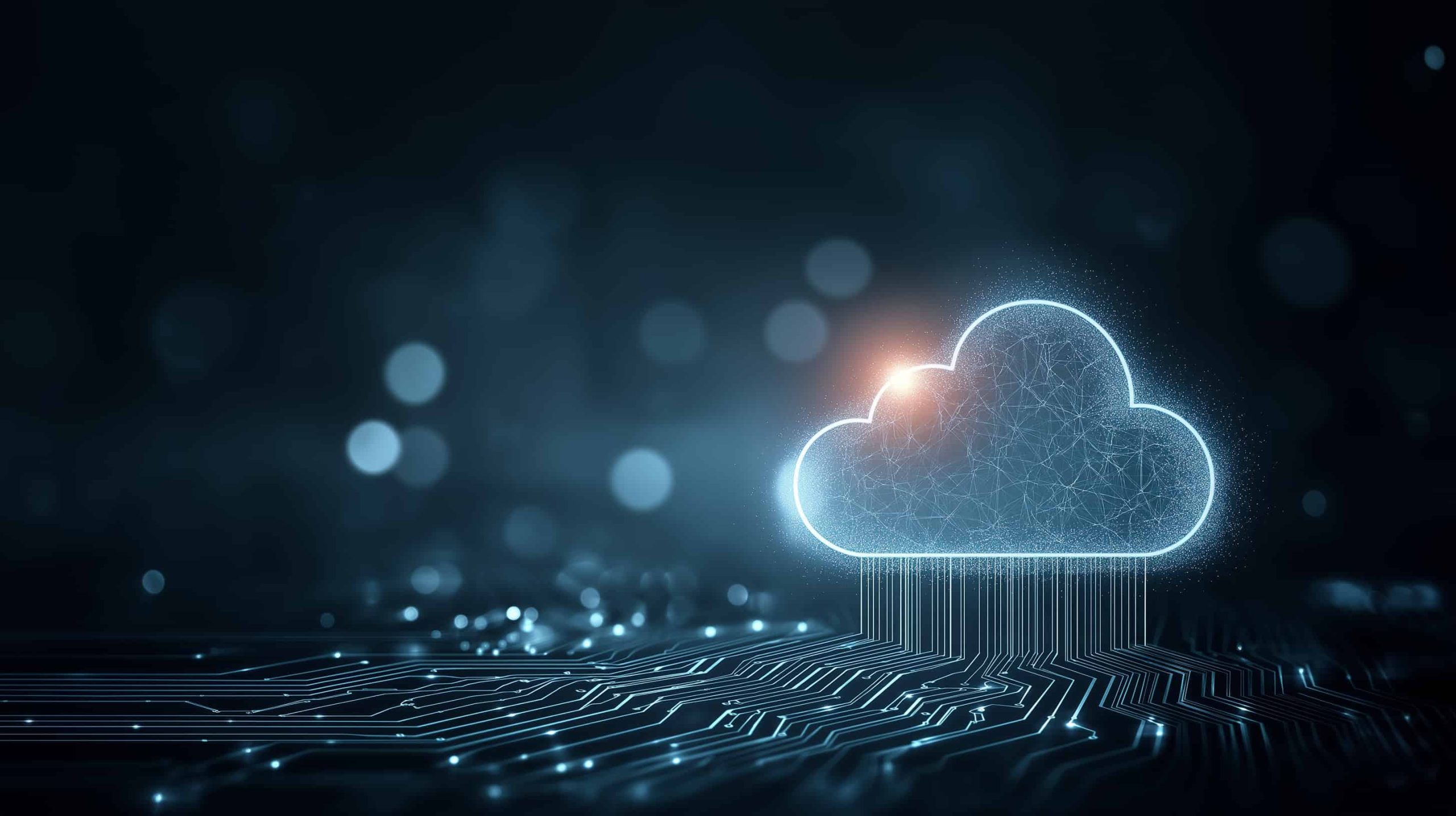 描述:线框质感的科技云漂浮在精密电路板上,云体带发光细节,背景暗调且光斑点缀,充满未来科技感,传递云计算、数字科技内涵,适用于科技展示、创意海报等场景。