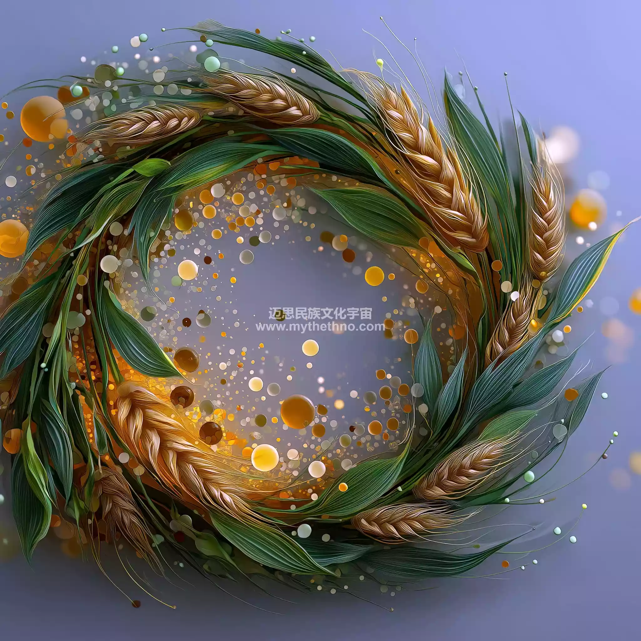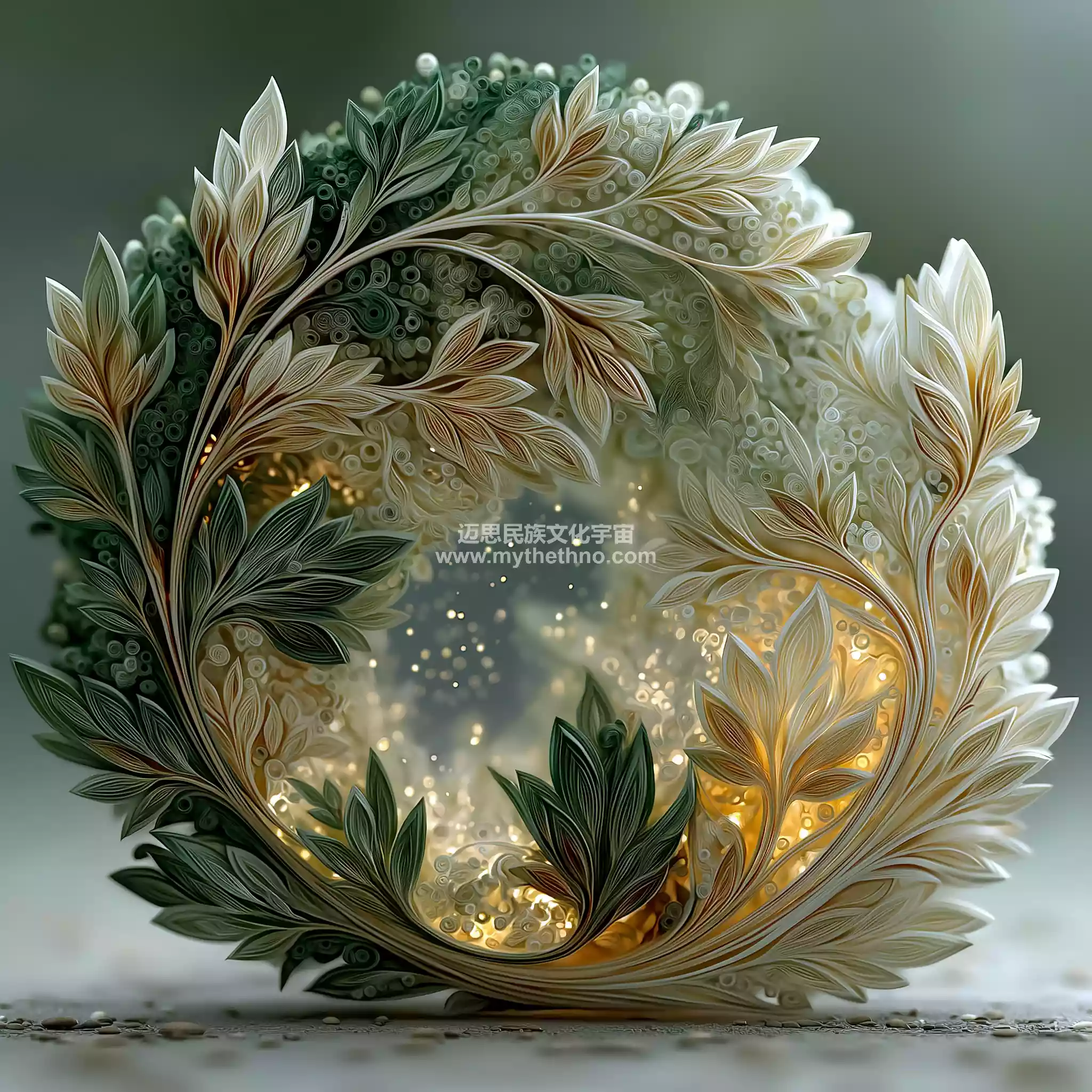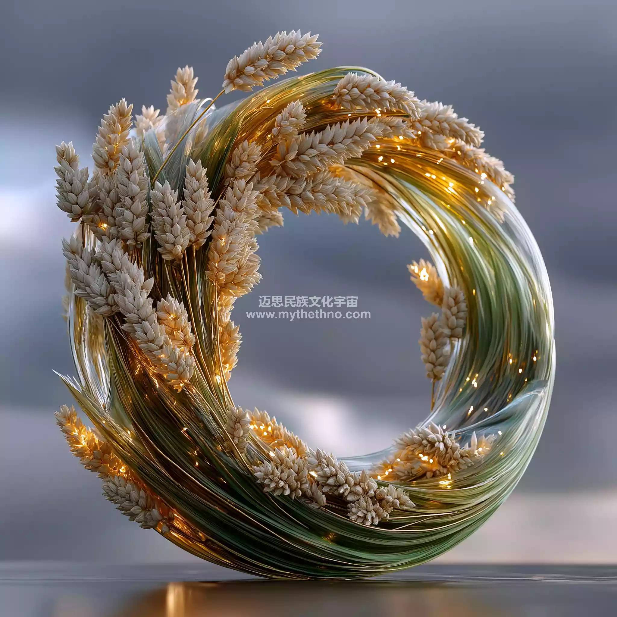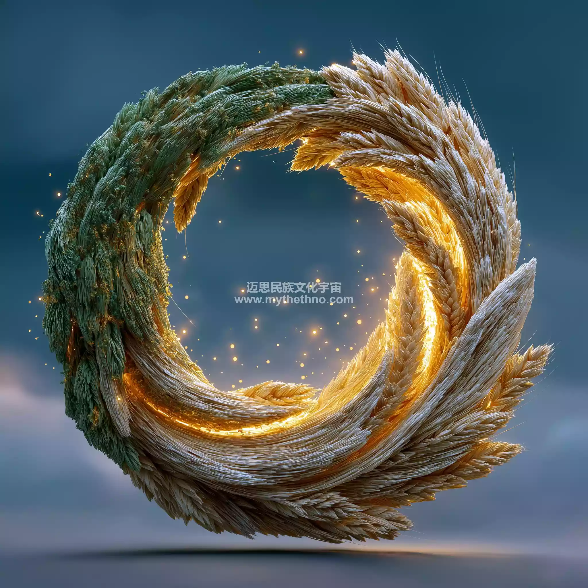 描述:常青枝、麦穗、葡萄藤的虚影交织成一个环形,环形中流淌着淡金色的光纹,象征 “自然循环、生生不息”,呼应农神节的丰收信仰。背景是淡绿色的天空,环形的旋转缓慢,光纹流动柔和,虚影的纹理清晰,营造出 “自然与神明共生” 的和谐氛围。