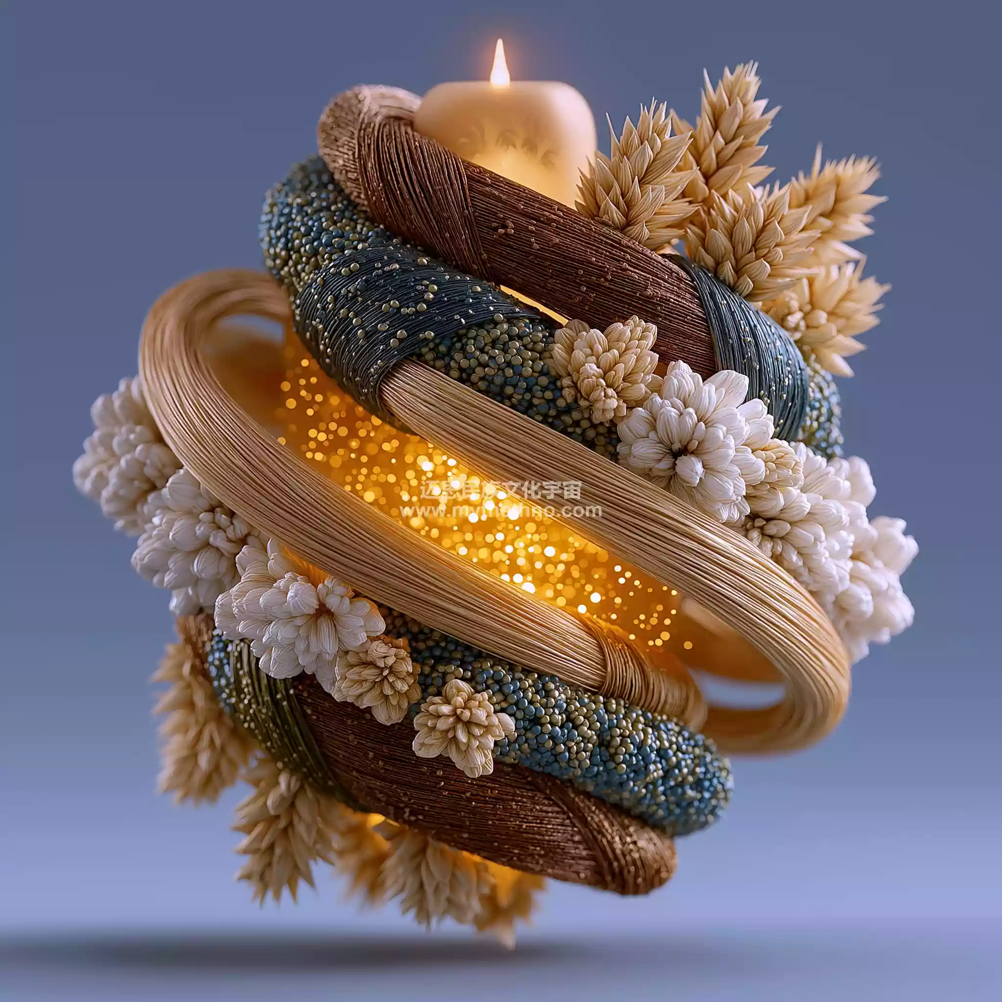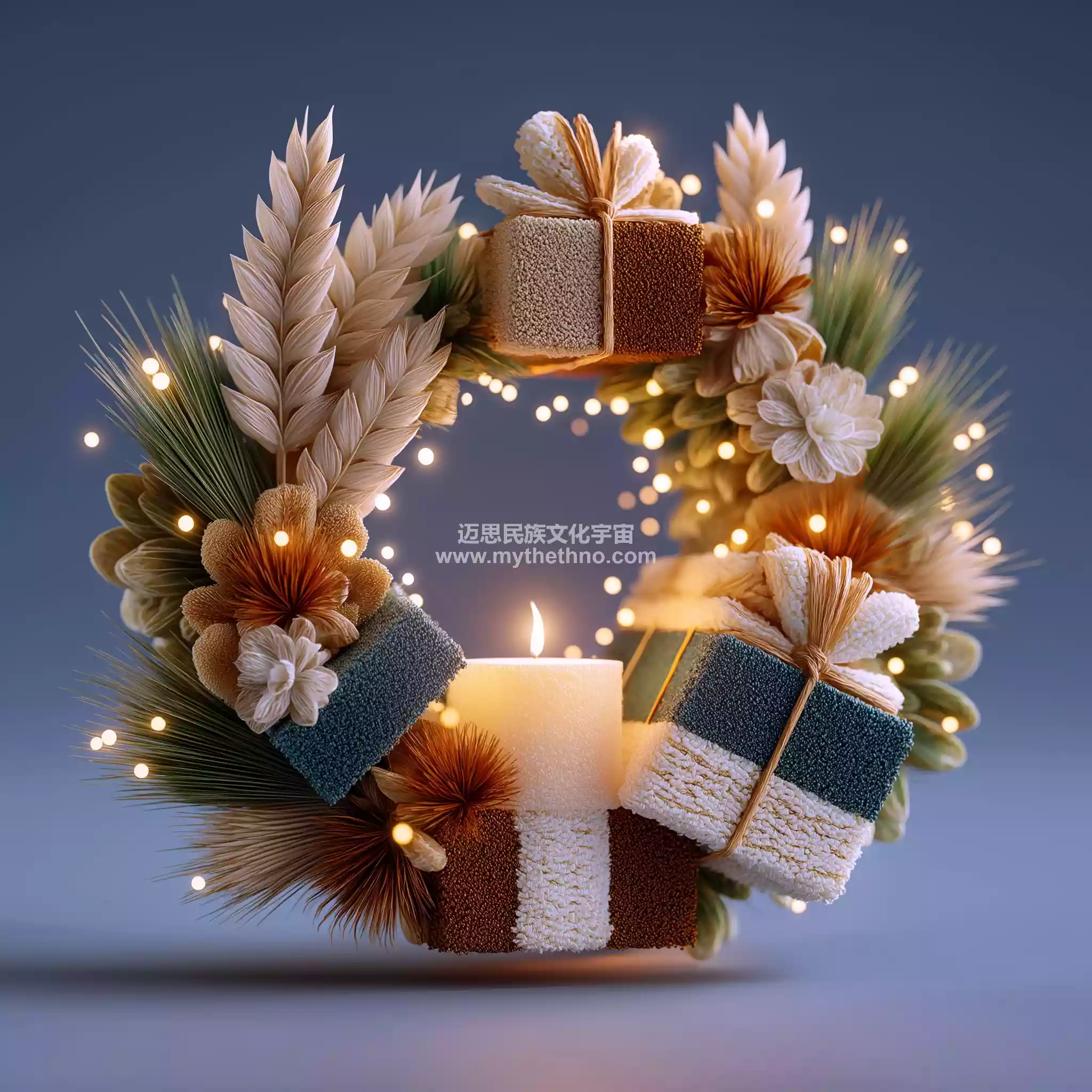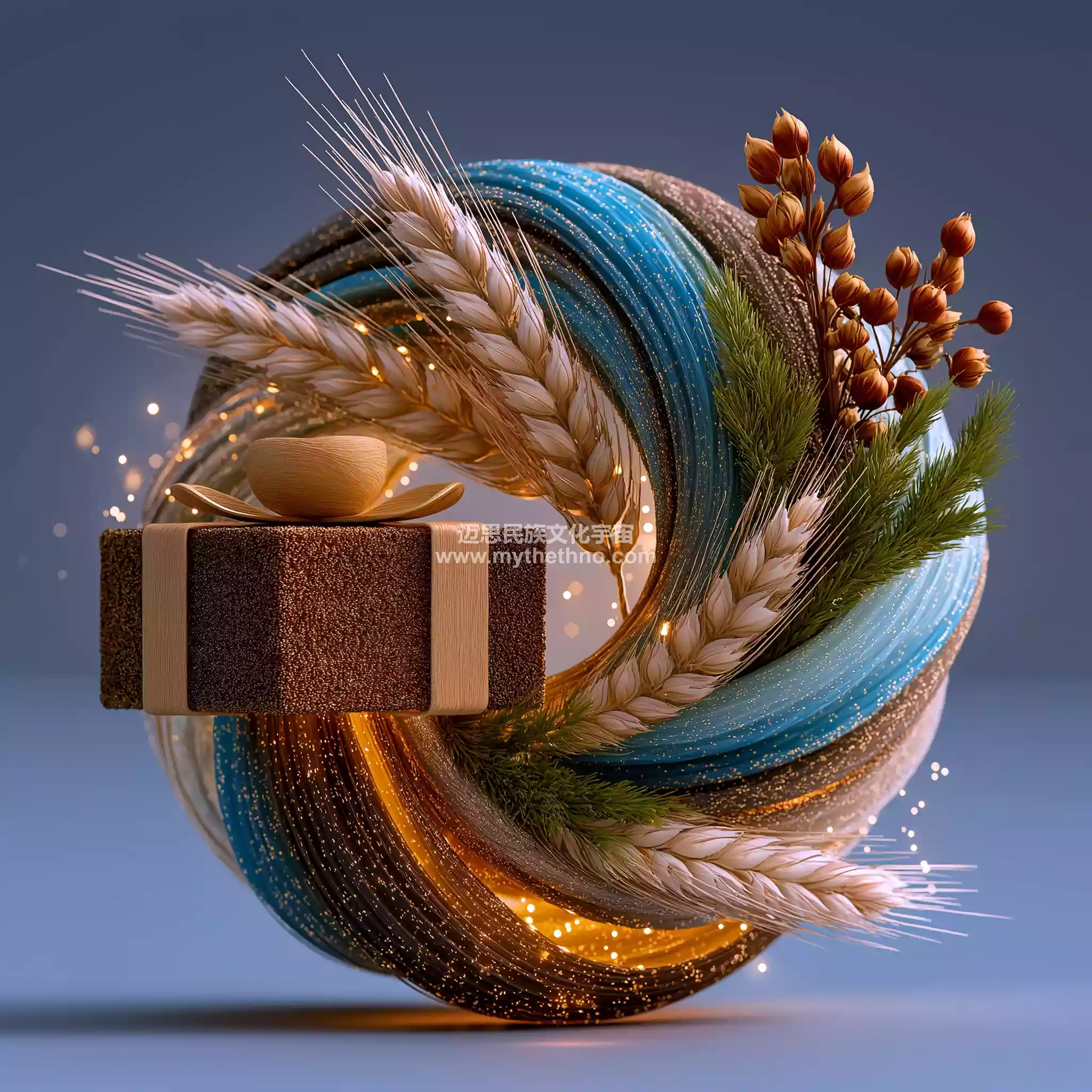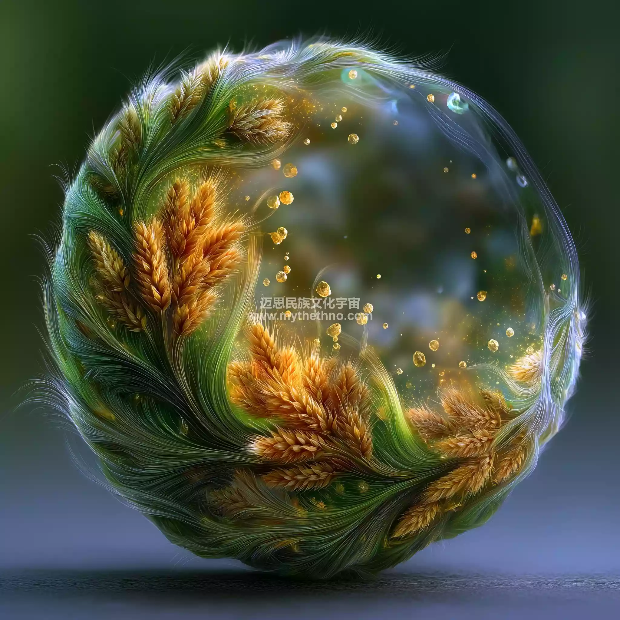 描述:常青枝、麦穗、葡萄藤的虚影交织成一个环形,环形中流淌着淡金色的光纹,象征 “自然循环、生生不息”,呼应农神节的丰收信仰。背景是淡绿色的天空,环形的旋转缓慢,光纹流动柔和,虚影的纹理清晰,营造出 “自然与神明共生” 的和谐氛围。