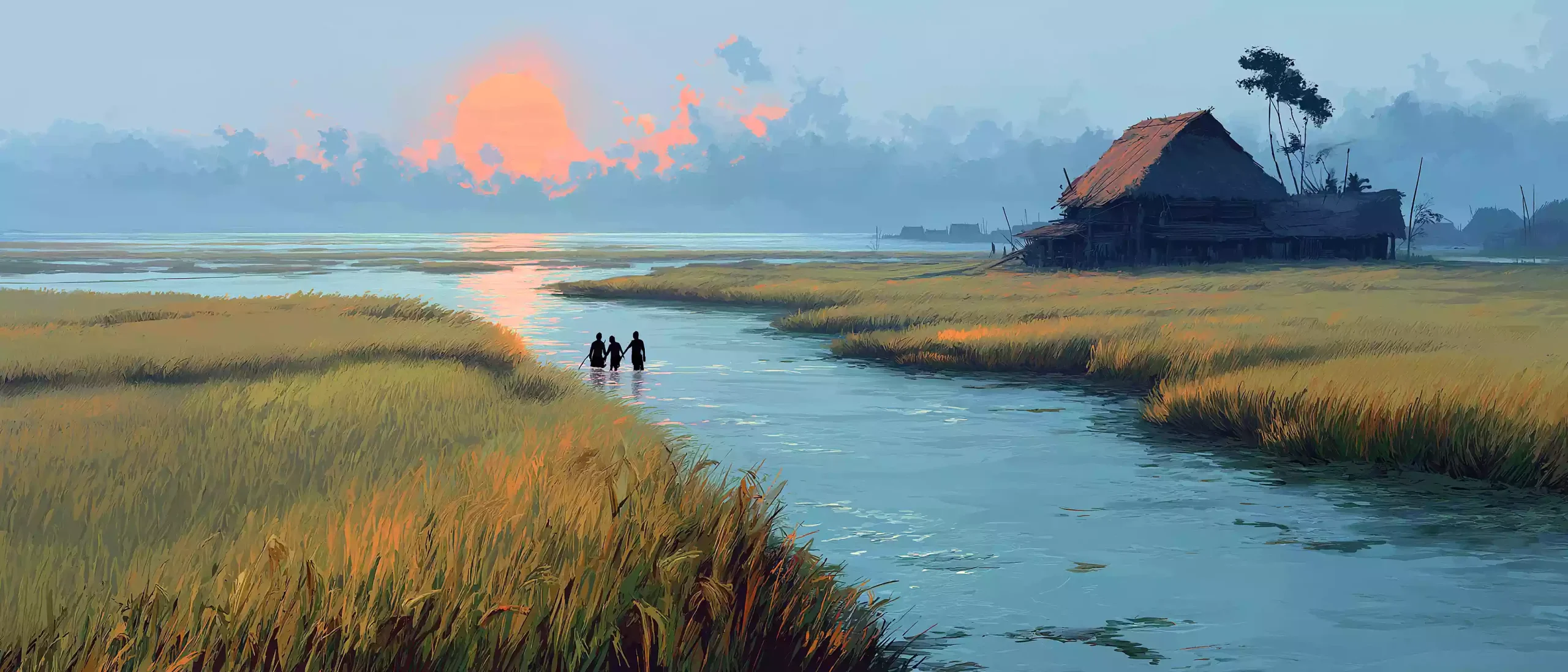 画面:苗族上古传说中九黎与三苗史诗时期的晨曦,九黎族农人们(弯腰劳作远影无面部特写)在广阔平原的水田中插翠绿稻秧,水田如镜倒映天空霞光;远处茅草屋村落升起袅袅炊烟,晨光洒遍田野,画面温暖生机,歌颂此时期苗族农耕文明的起源。
