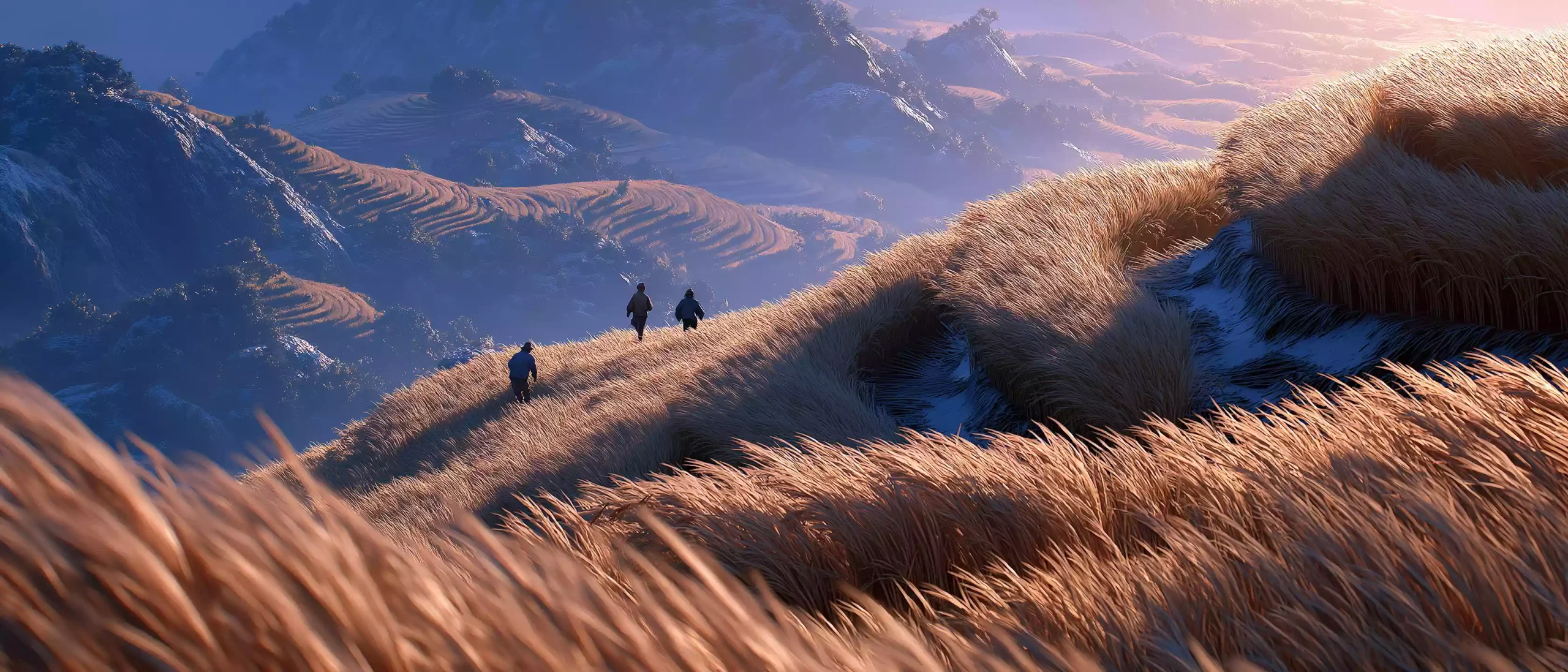 画面:苗族上古传说中九黎与三苗史诗时期的夕阳,广角俯拍广阔梯田,金色稻浪随风起伏;九黎、三苗农人(忙碌微小剪影)弯腰收割,稻谷整齐铺田埂;近景饱满稻穗特写挂露珠,反射金色阳光,满是此时期丰收的喜悦与对土地的感恩。