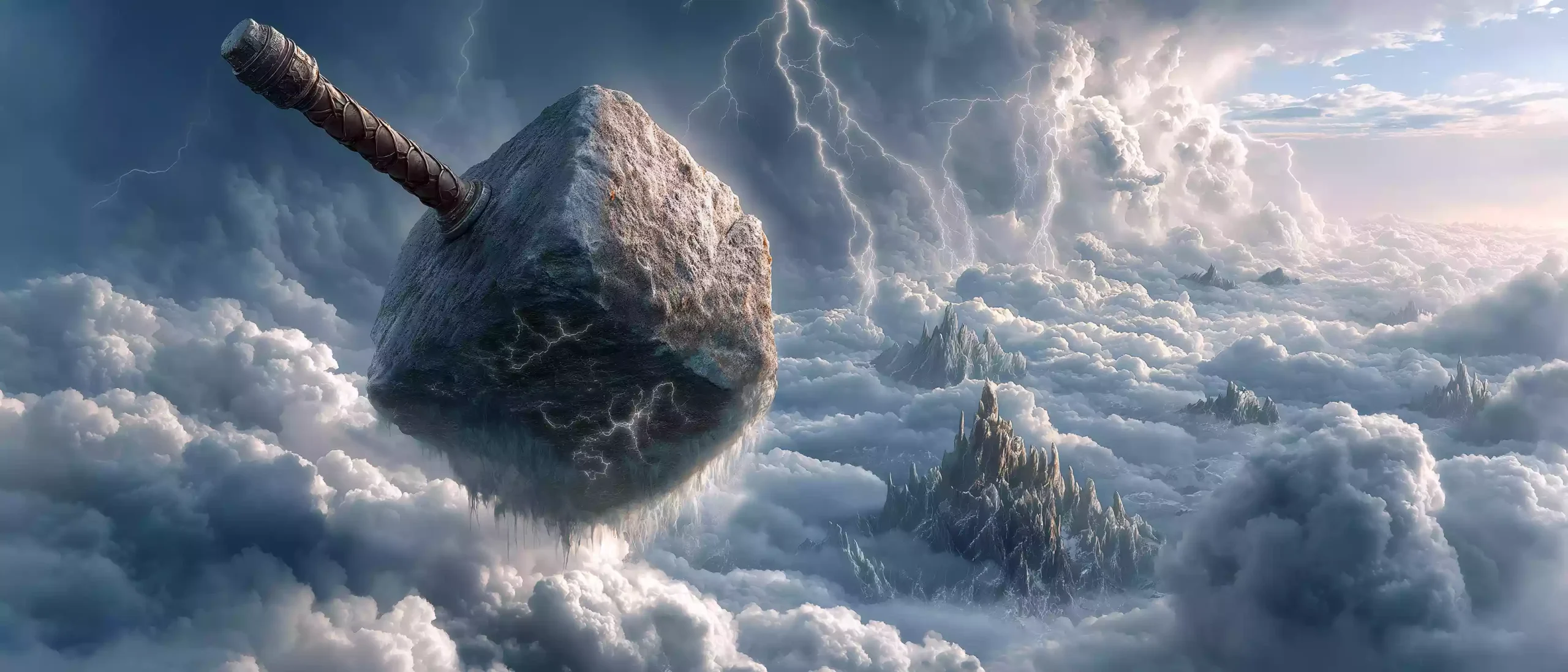 画面:苗族上古传说中九黎与三苗史诗时期的概念场景,狂风暴雨电闪雷鸣的云层之巅,悬浮非人力举起的巨大石锤,表面有古老雷电纹与灼烧痕;石锤被无形力量抡动,引万钧雷霆劈下界,是此时期自然伟力与天道刑罚的象征,威严。