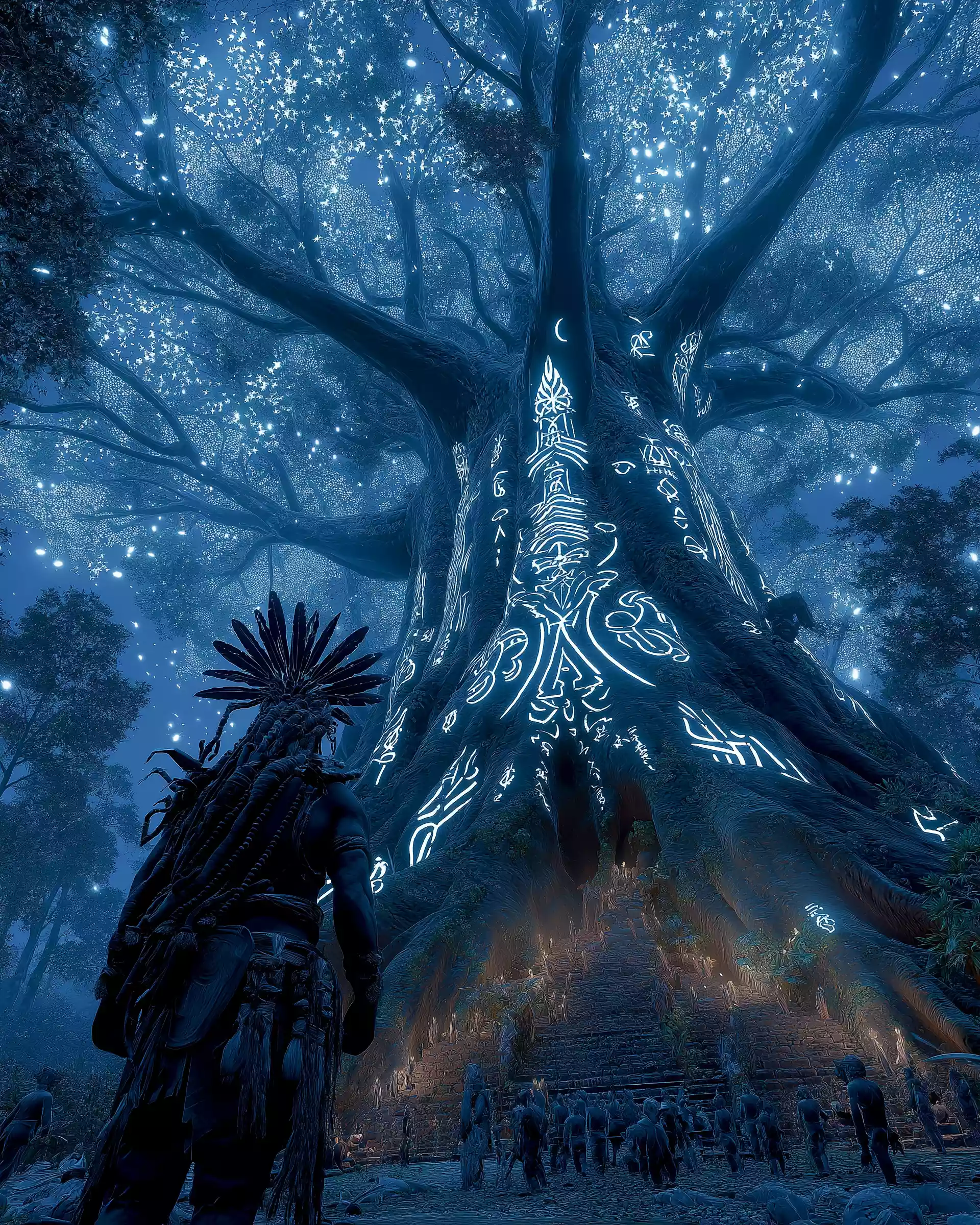 画面:夜晚祭坛中央,粗犷带铭文的青铜神树(九枝、太阳轮、神鸟、铃铛)矗立;祭司背影张臂祈祝,树顶蓝色光柱连北斗七星,铃铛无风自鸣,声波纹路可见,神秘空灵。