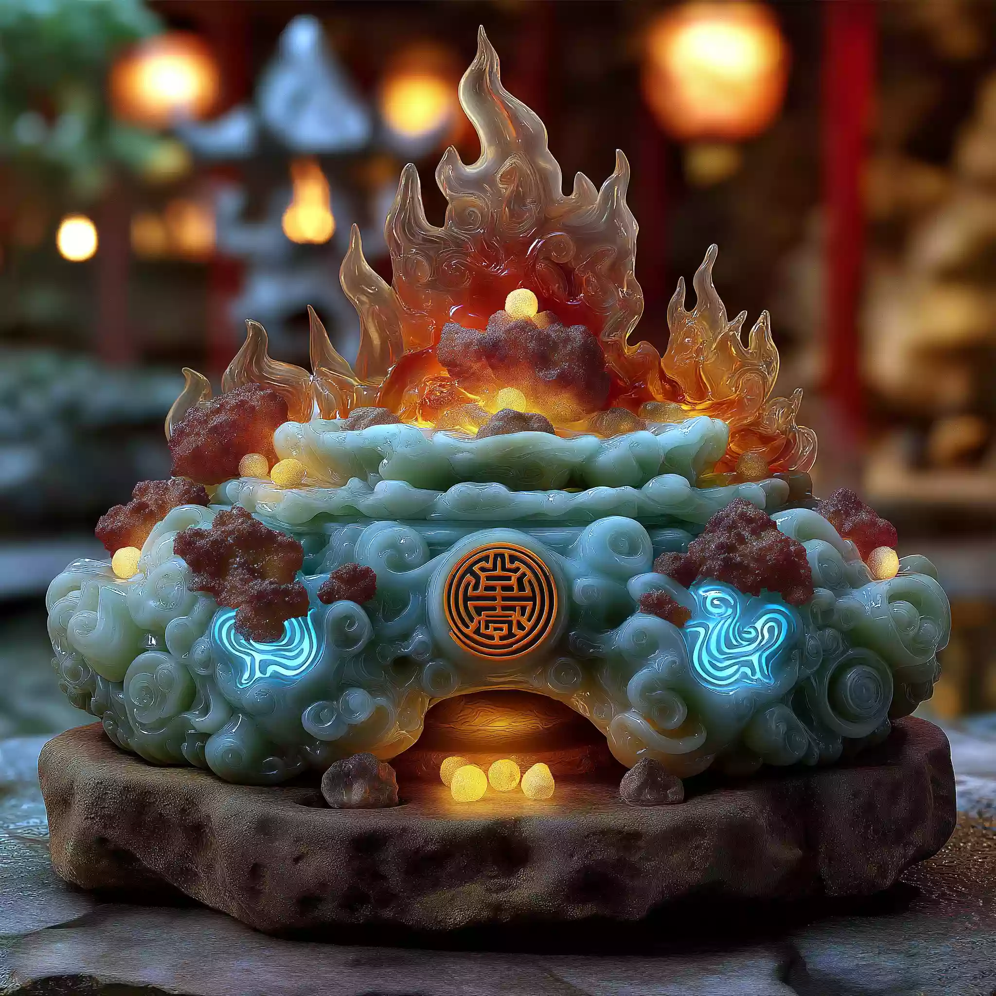 描述:《葛玄炼丹・灵宝丹韵》,聚焦三国时期葛玄道教炼丹场景。画面中心是淡绿色玉石丹炉,带云纹,炉口喷红焰与金色能量粒子。周围散落朱砂、雄黄等药材,间有白色丹气流动。右侧悬蓝色能量符号,背景是黑色山洞轮廓。侧光凸显玉炉通透与火焰亮色,传递道教炼丹文化内涵。