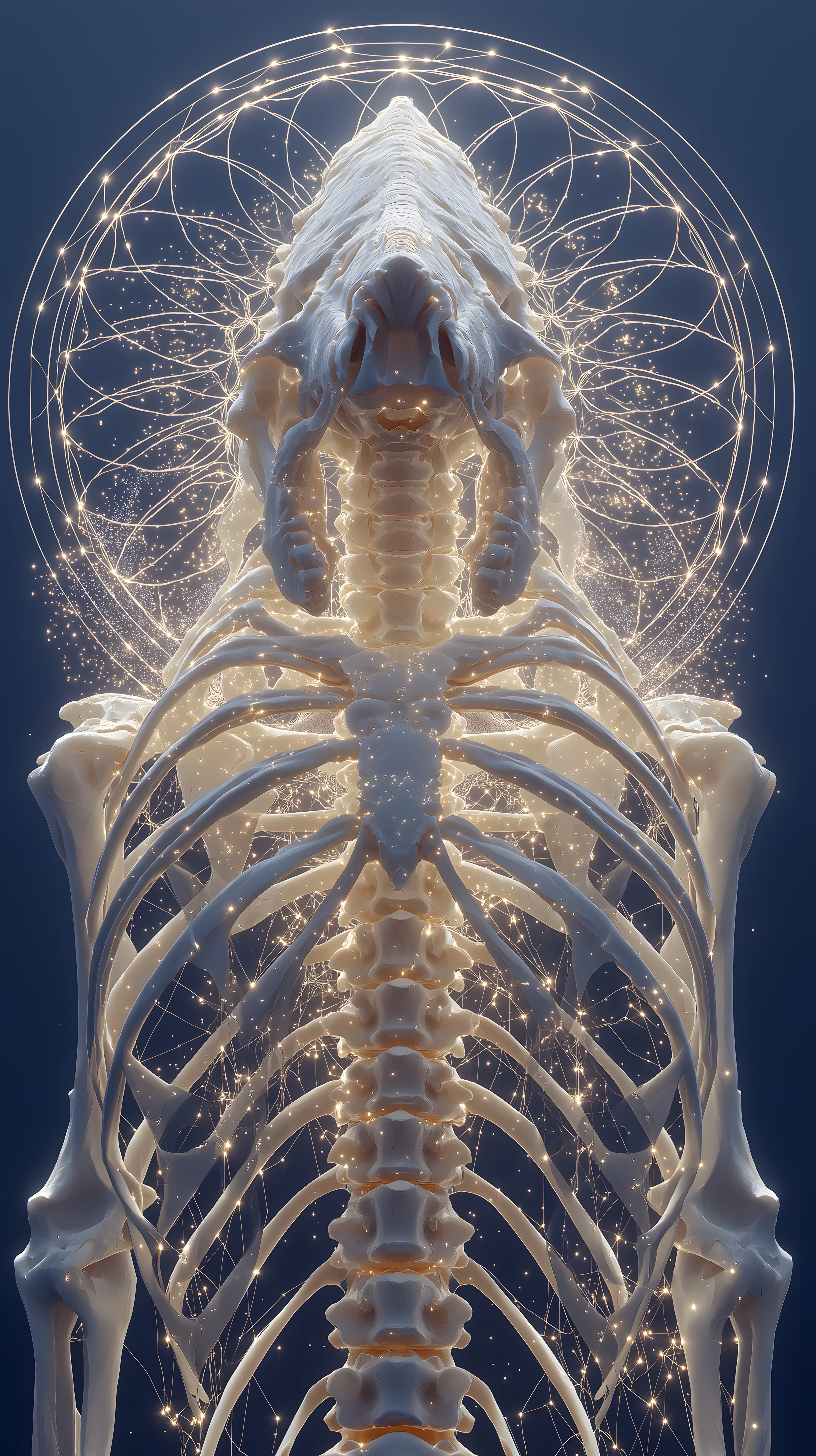 画面描述:海神骨骼在液态宇宙中沉浮,珊瑚状肋骨间游动发光海怪胚胎,脊椎顶端喷射星座渔网,骨盆化石化为特赖登螺号,诠释希腊海神蓬托斯的意象,承载对海洋与海神的信仰。