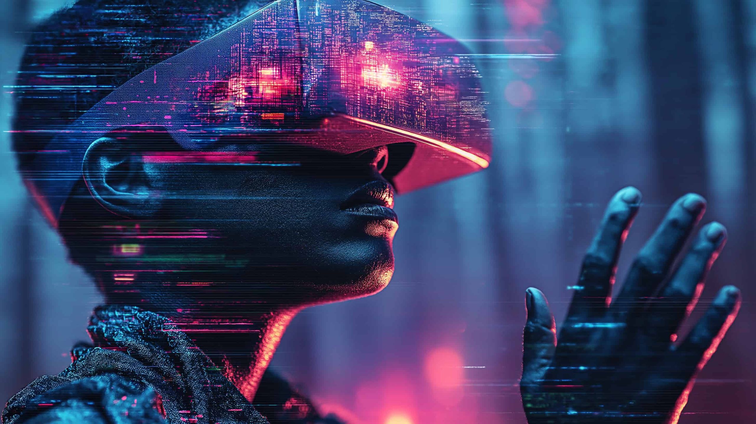 描述:呈现人物佩戴带有霓虹数字纹理的 VR 设备,画面融合蓝粉赛博朋克光影与故障艺术线条,传递虚拟现实、元宇宙的未来交互感,适用于科技展示、创意海报等场景。