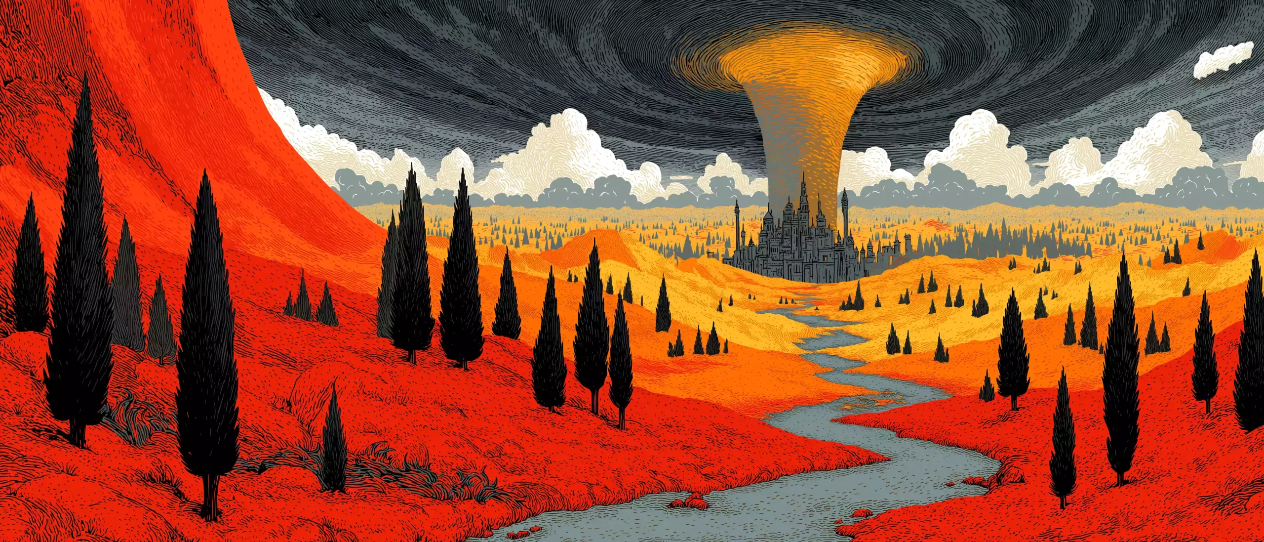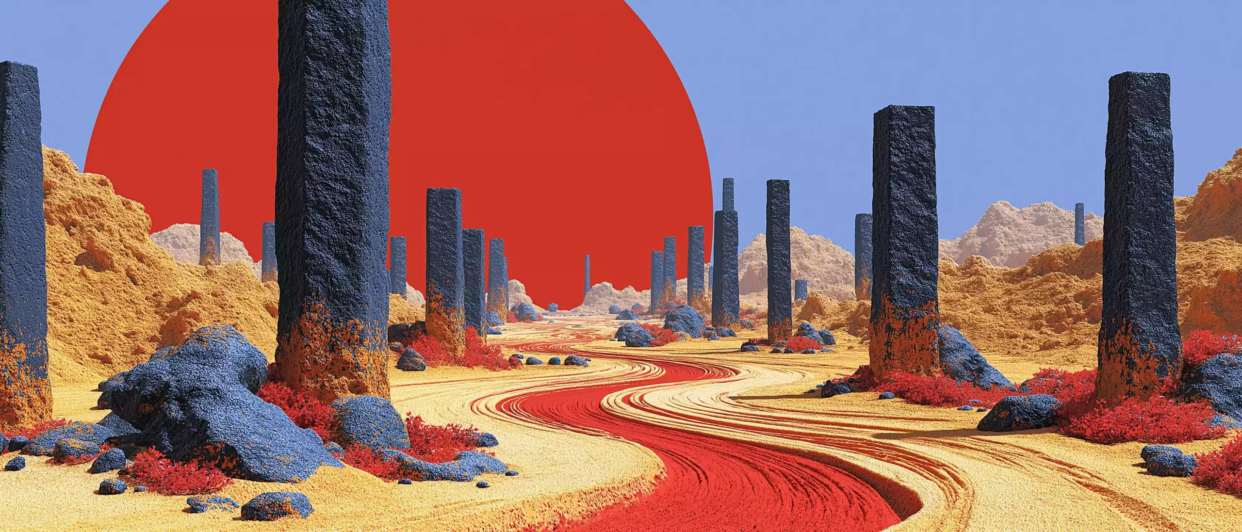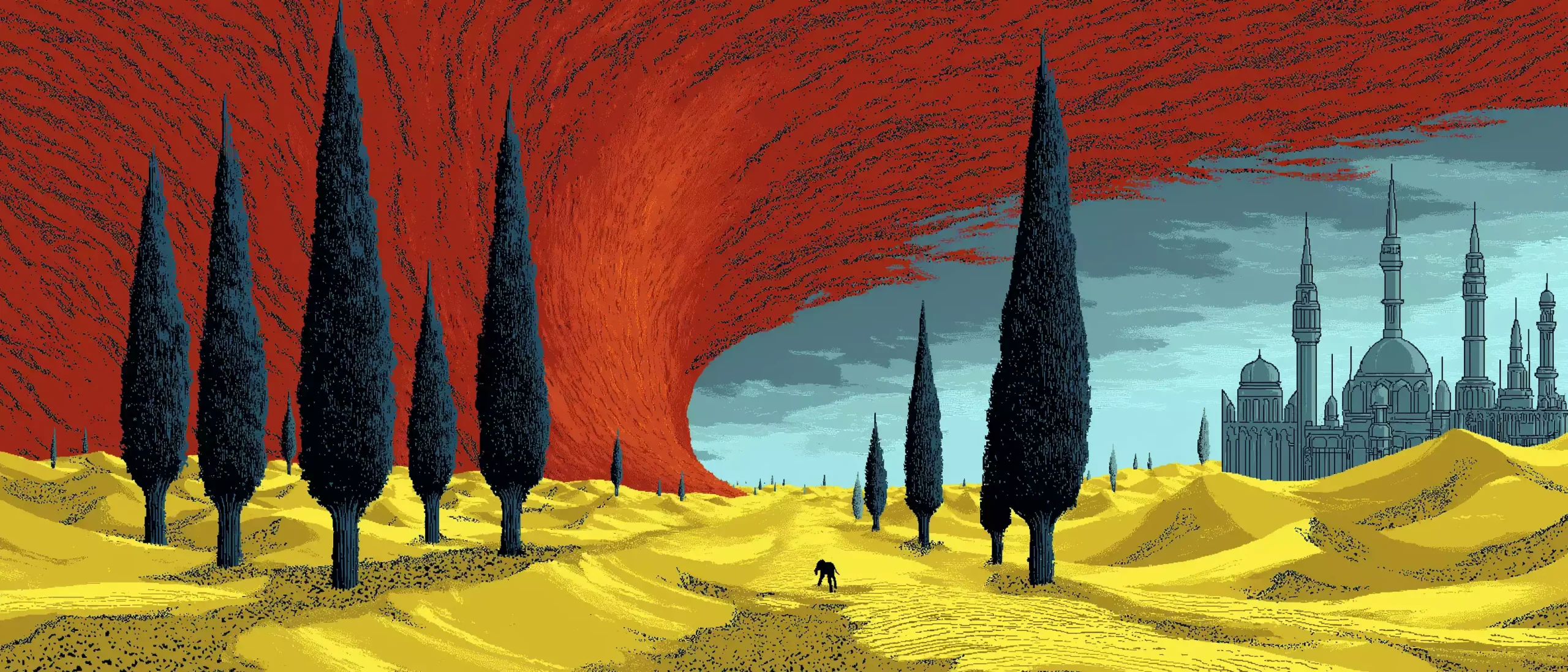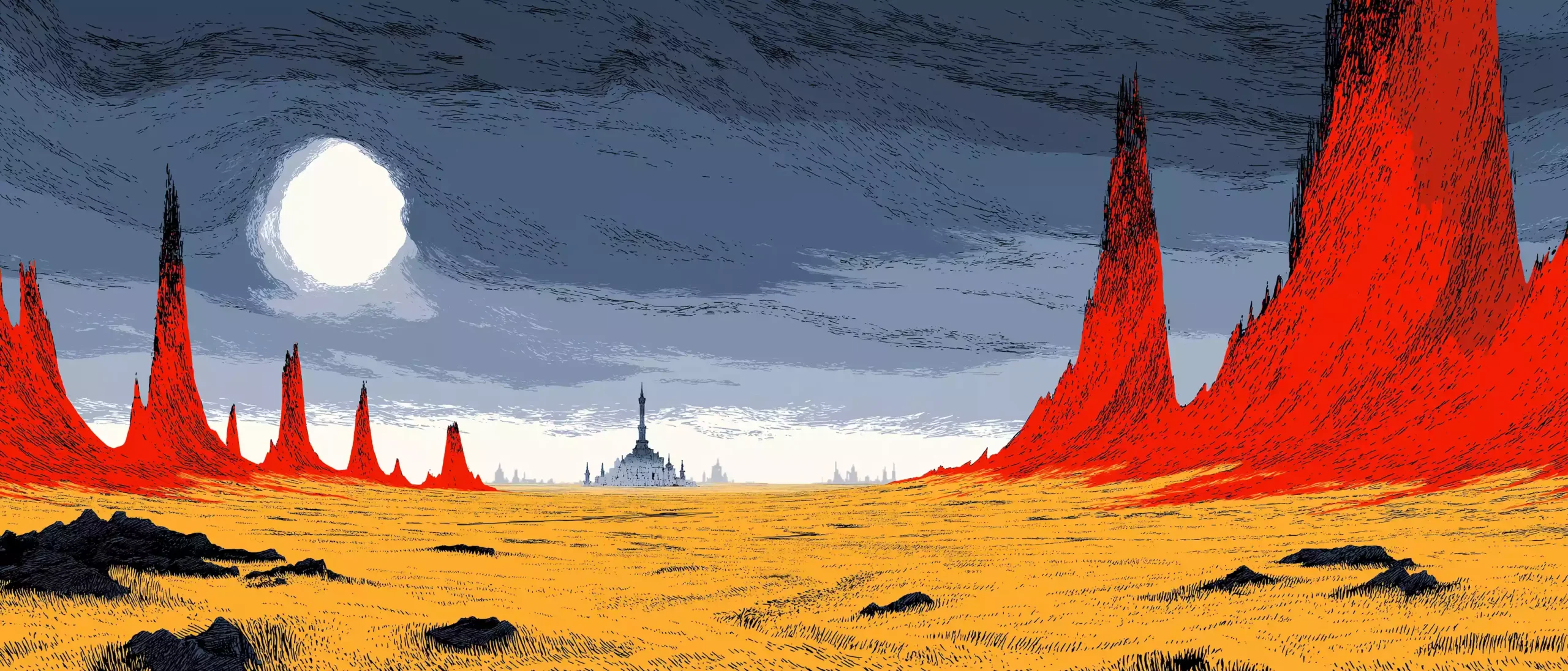 描述:《赛特的沙漠王国》,古埃及神祇纷争背景下,暗黄色沙漠分布刻豺狼头符号(赛特象征)的黑色岩石虚影。岩石间旋转沙柱渗暗红能量(干旱与破坏),地平线处扭曲海市蜃楼浮现破碎宫殿轮廓(觊觎王权),灰黄色天空缀暗淡星辰。画面凸显赛特的狂暴与对王权的野心。