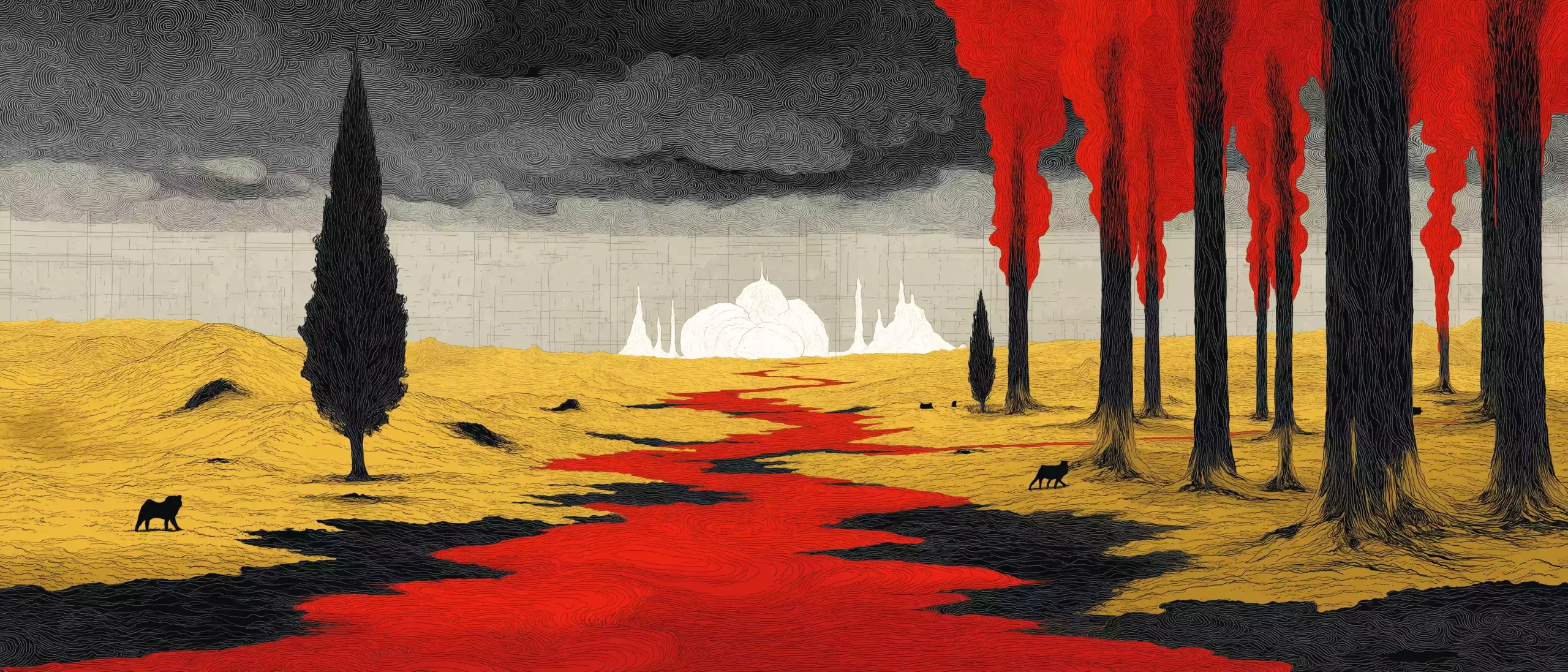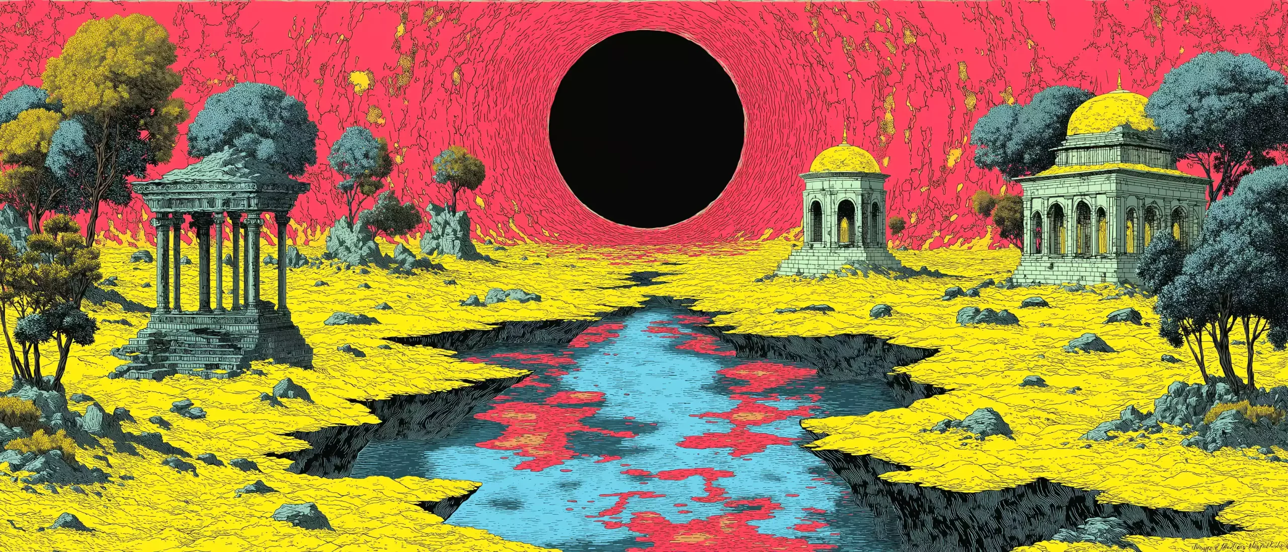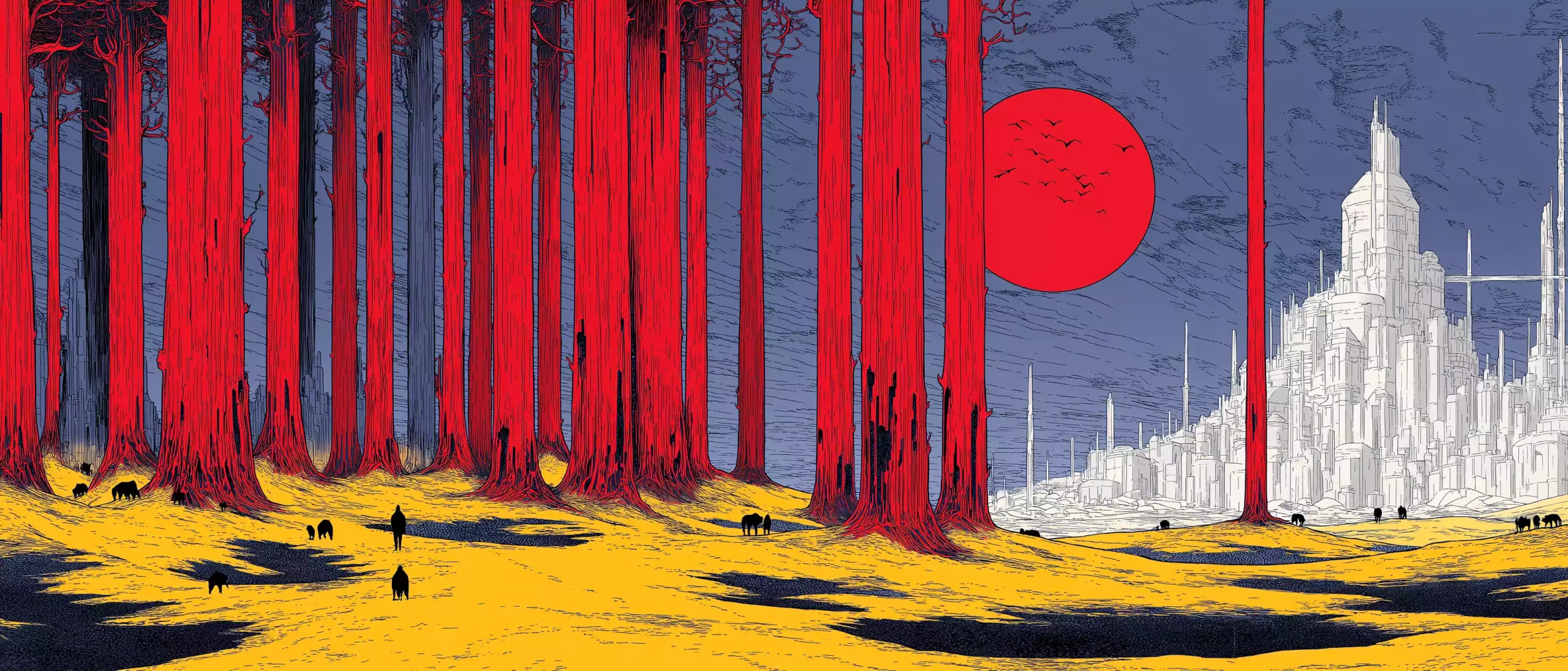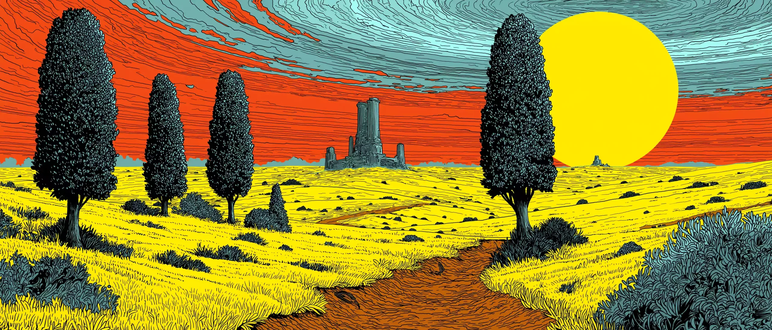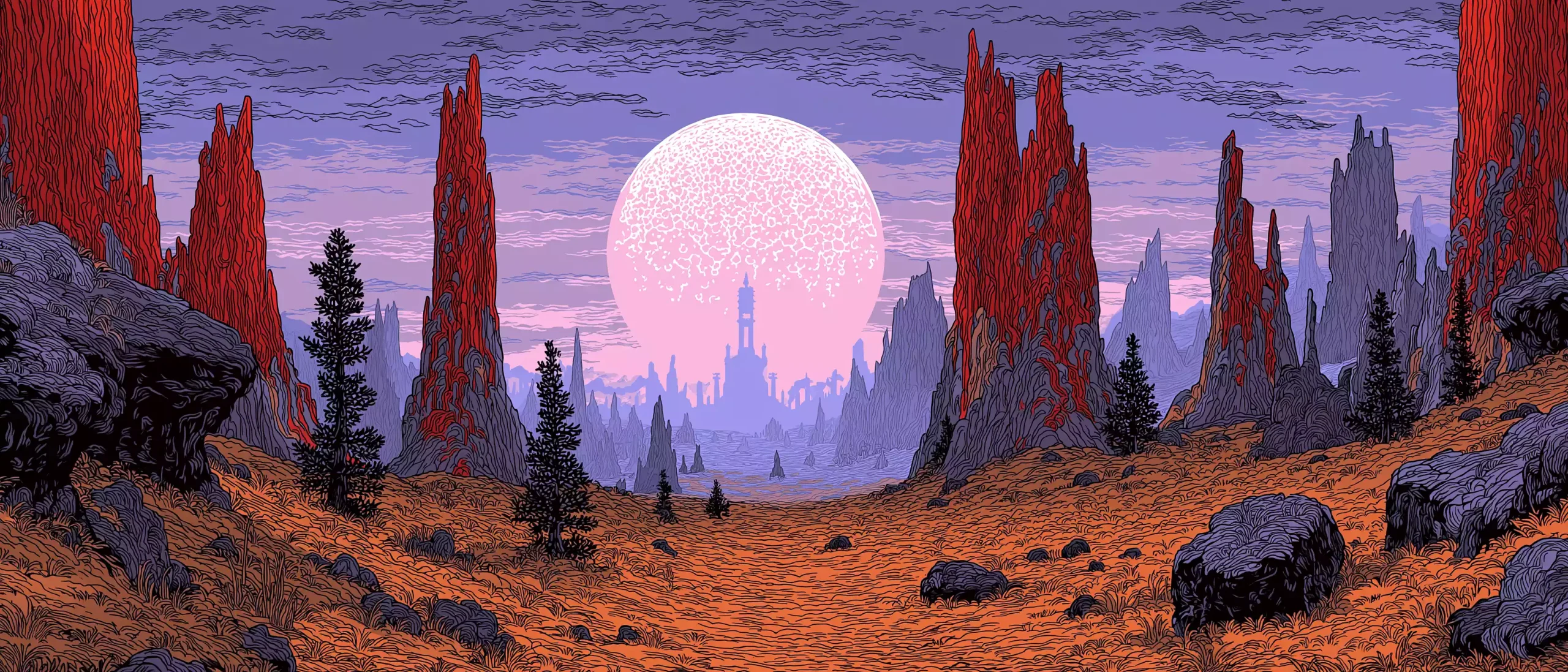 描述:《赛特的沙漠王国》,古埃及神祇纷争背景下,暗黄色沙漠分布刻豺狼头符号(赛特象征)的黑色岩石虚影。岩石间旋转沙柱渗暗红能量(干旱与破坏),地平线处扭曲海市蜃楼浮现破碎宫殿轮廓(觊觎王权),灰黄色天空缀暗淡星辰。画面凸显赛特的狂暴与对王权的野心。