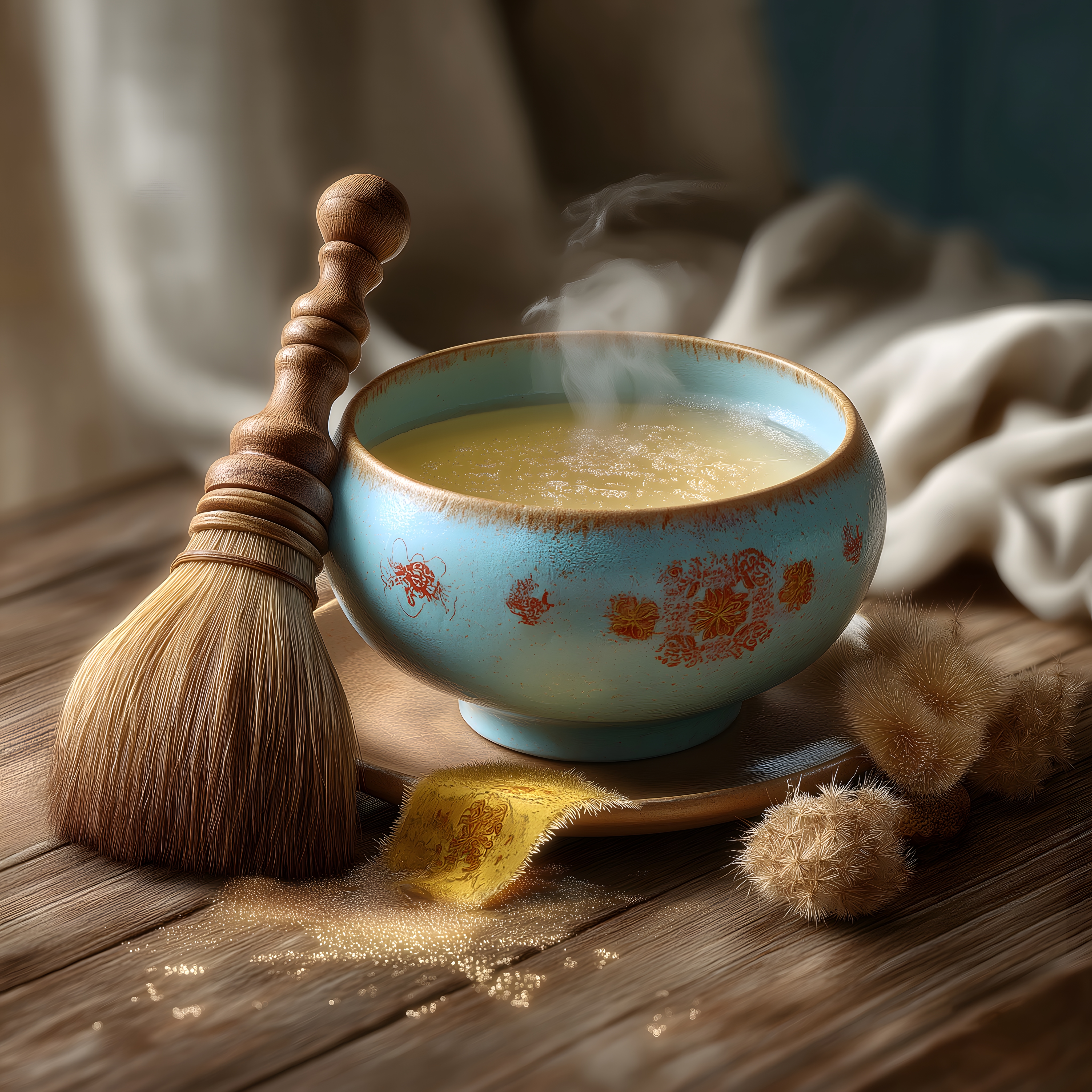 画面描述:木案瓷碗盛泉,符纸半浮于水,朱砂符文隐现,符纸、狼毫、绢布静立,帐幔雾漫,愈字虚影闪烁,柔焦神秘,诠释符水祛病、祈福安康的道教文化。