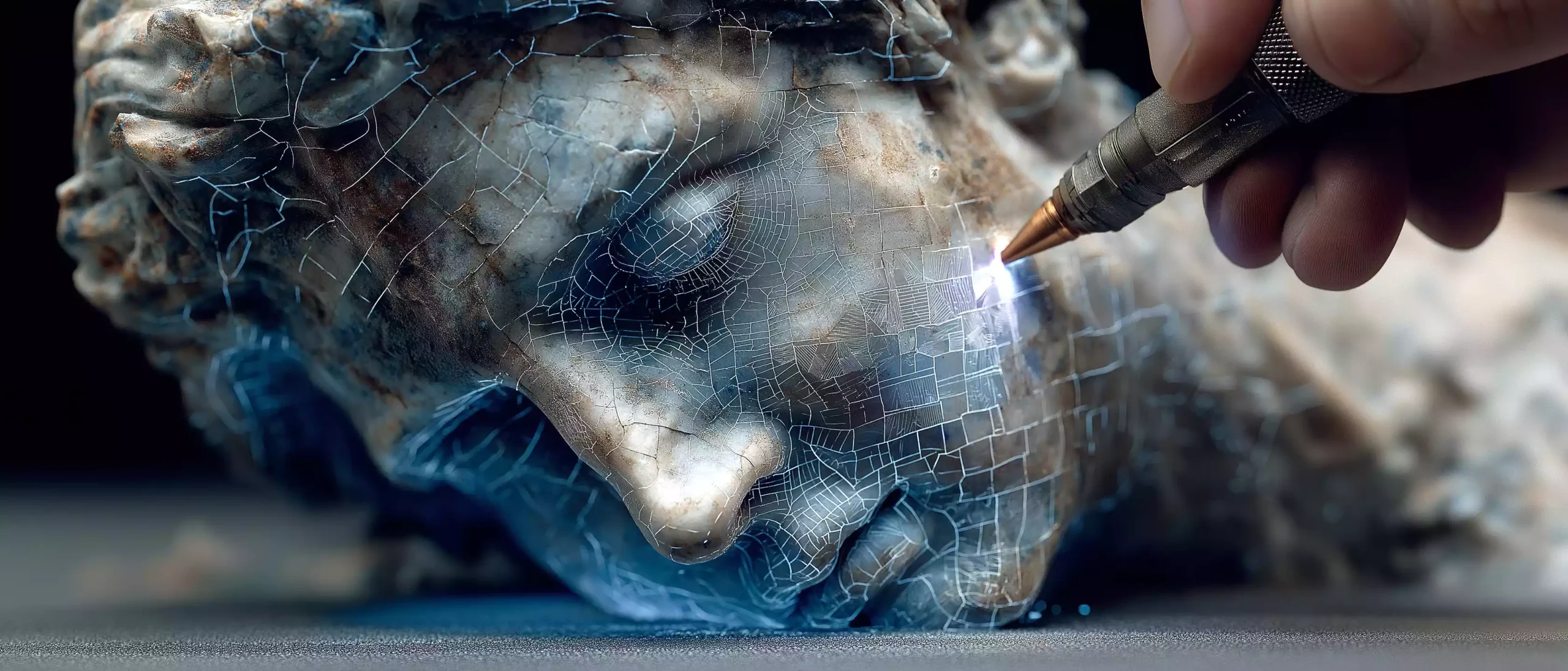 描述:阿克特翁虚拟猎场》,依托希腊神话阿克特翁偷看女神沐浴被变成鹿的叙事,融合现代虚拟技术,鹿角头盔连接 VR 头显 —— 头盔呼应阿克特翁身份,VR 头显象征虚拟场景。狩猎矛化作数据导线,猎犬群像素化奔袭,林间池倒映游戏 UI 界面。画面将古典神话与虚拟体验结合,展现神话叙事的现代科技重构。