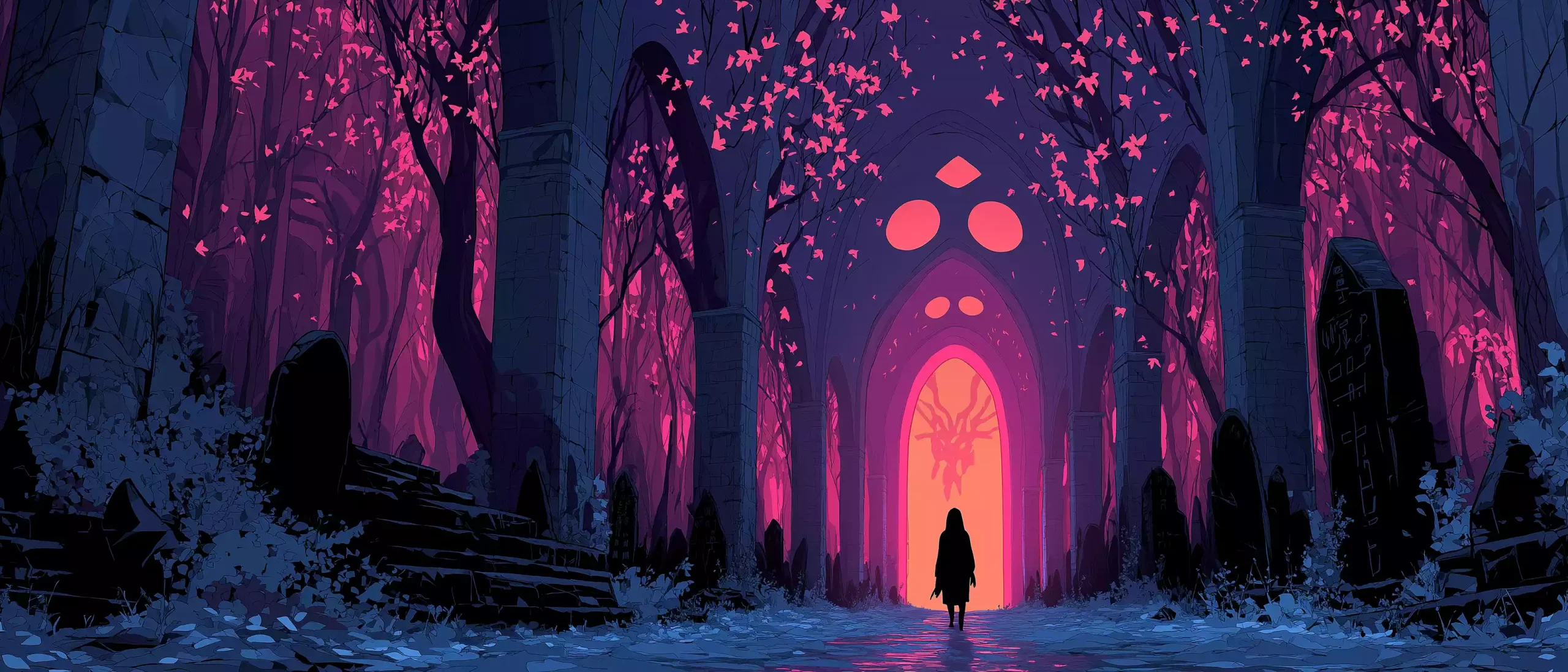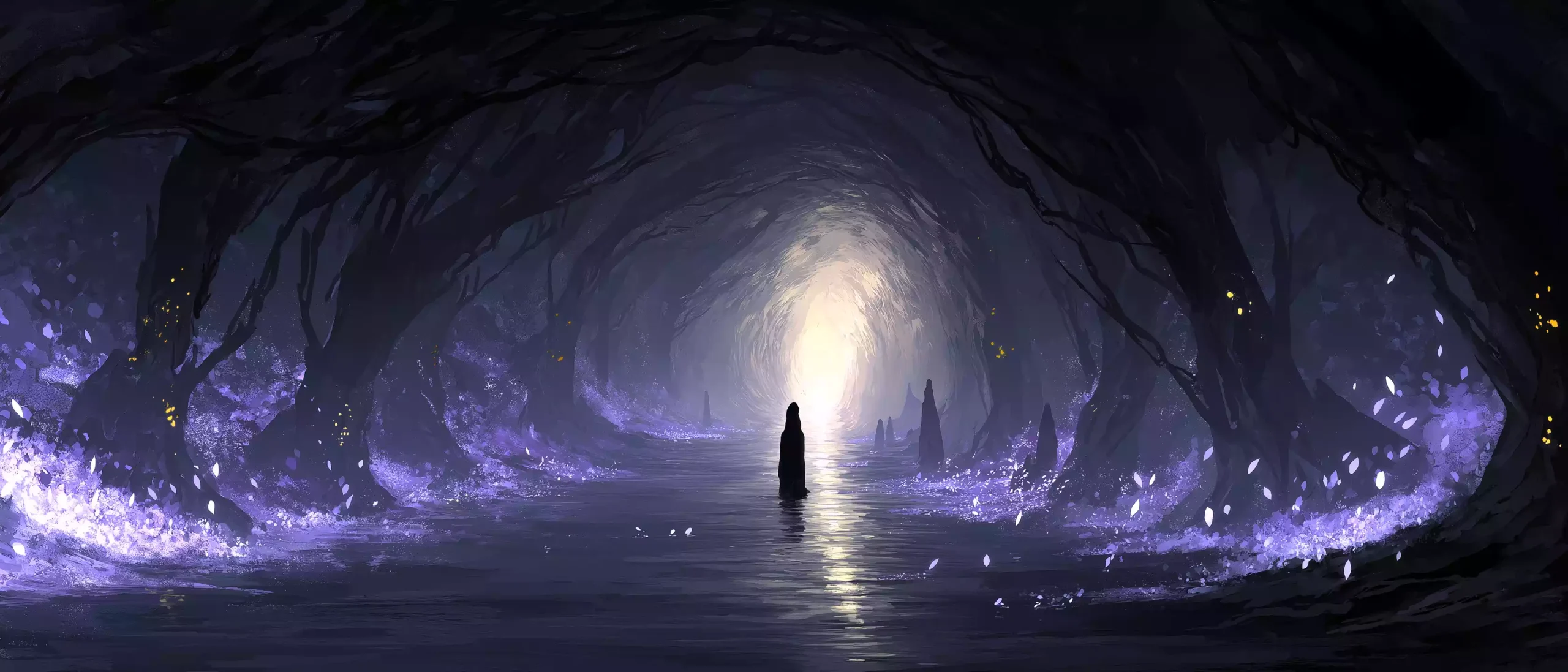 描述:《阿努比斯的引导》,公元前 3100 年 – 公元前 332 年古埃及来世信仰背景下,暗灰色冥界通道中,豺狼头抽象轮廓(阿努比斯)泛淡紫光晕在前引导。前方金色光带(通往审判室)漂浮白色羽毛(玛特象征),通道两侧黑色石柱虚影刻 “引路” 象形文字。画面以幽暗光影展现阿努比斯引导亡灵奔赴审判的核心场景,契合古埃及冥界叙事逻辑。