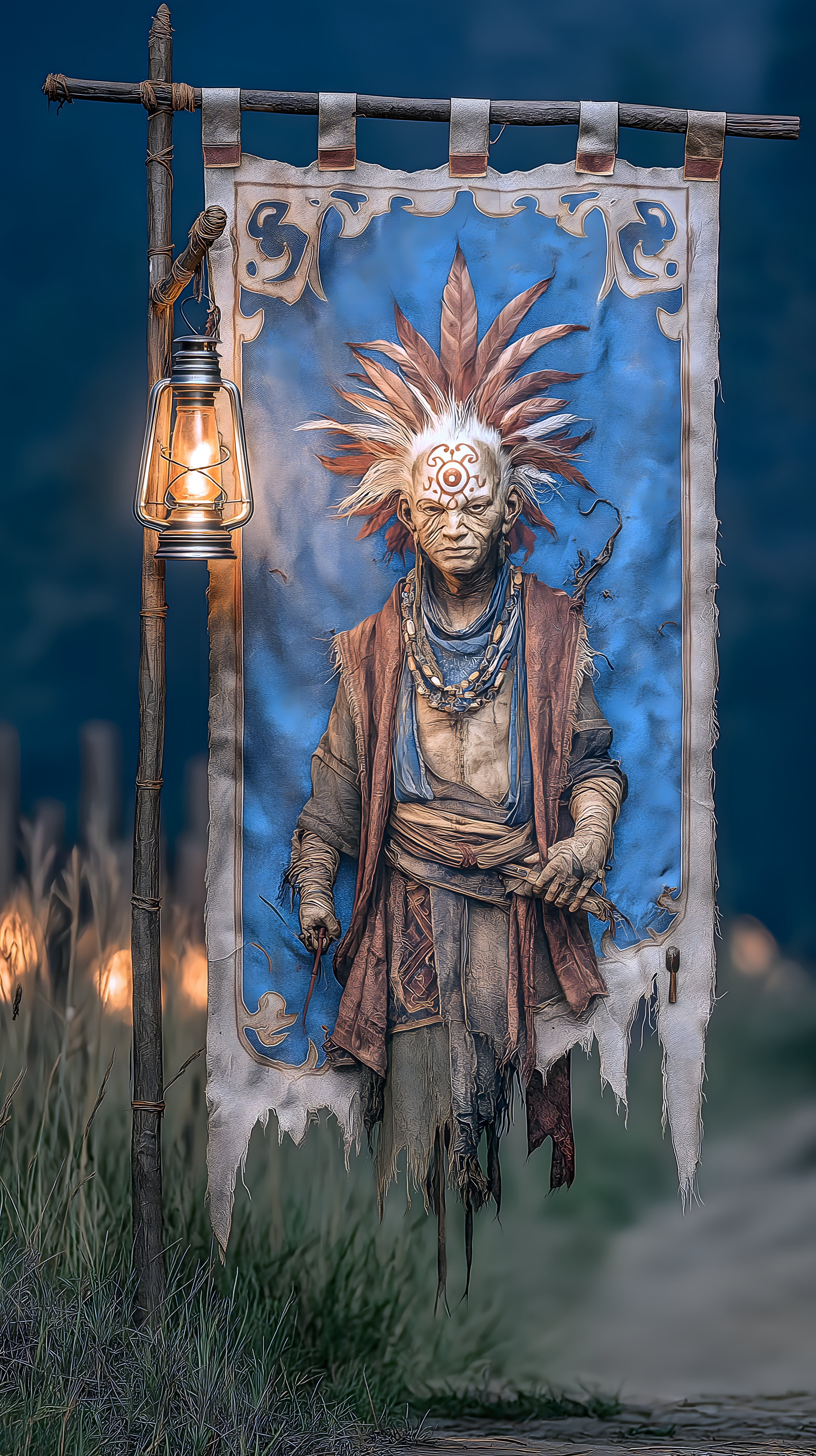 画面描述:展现苗族先民为客死异乡者举行的招魂仪式,死者衣物悬挂竹竿,巫者法器引导灵魂光点沿发光道路向北方故土归去,路旁魂幡飘动,异乡夜空为背景,灵魂光点微弱坚定,归路光芒温暖,凸显先民对故土的思念与对逝者的敬畏,承载苗族招魂文化的传统记忆。