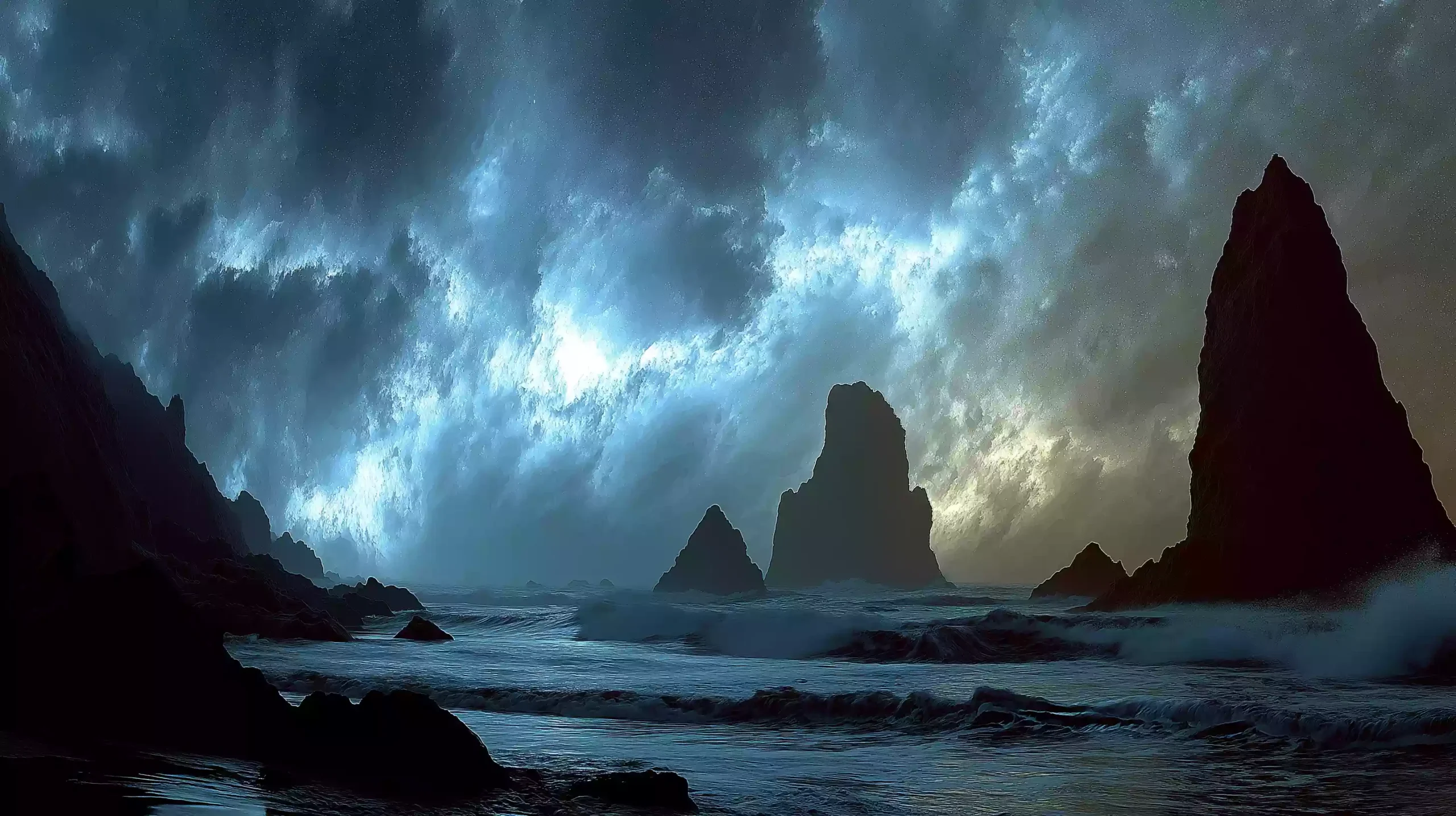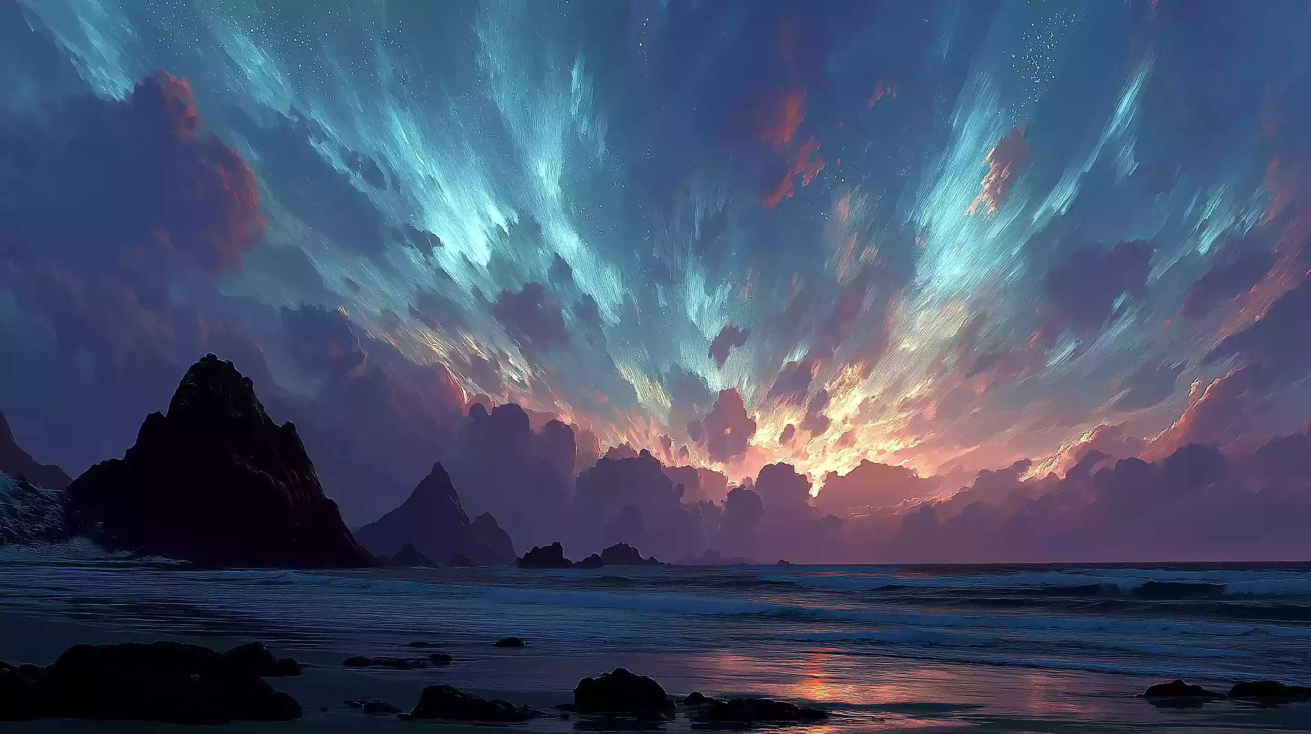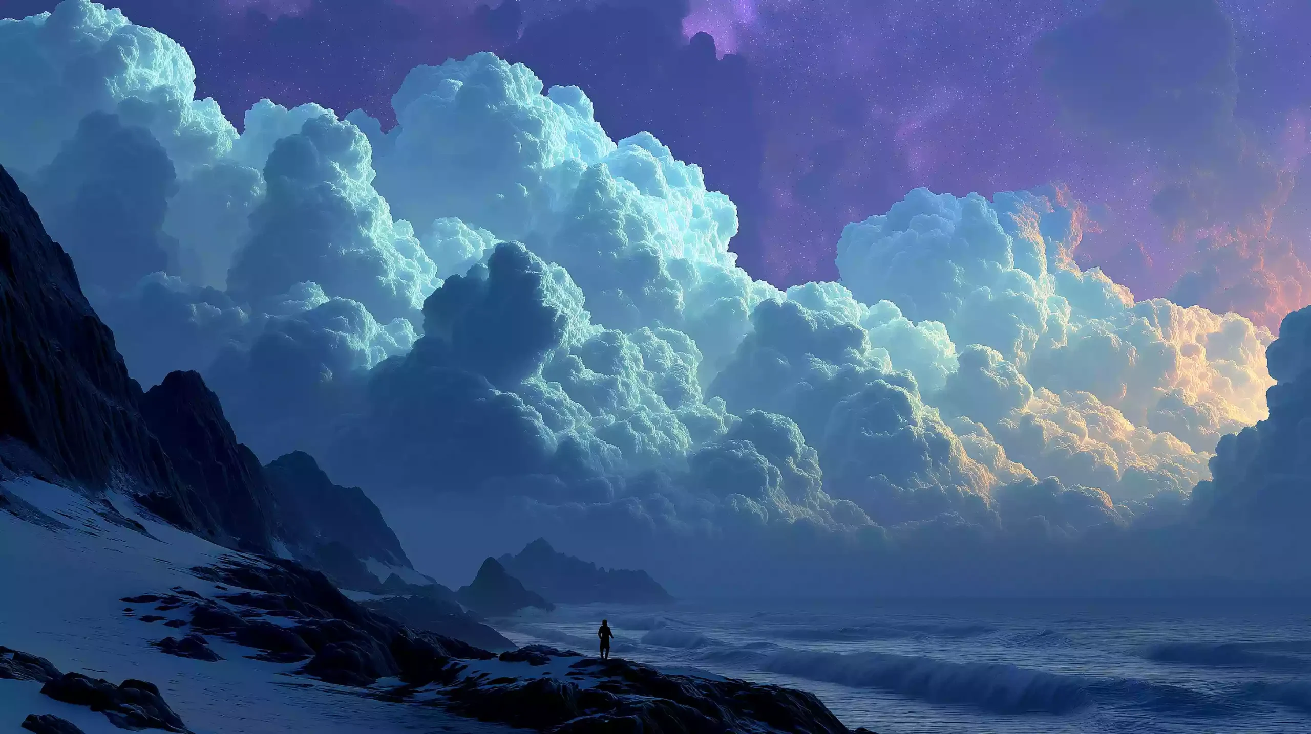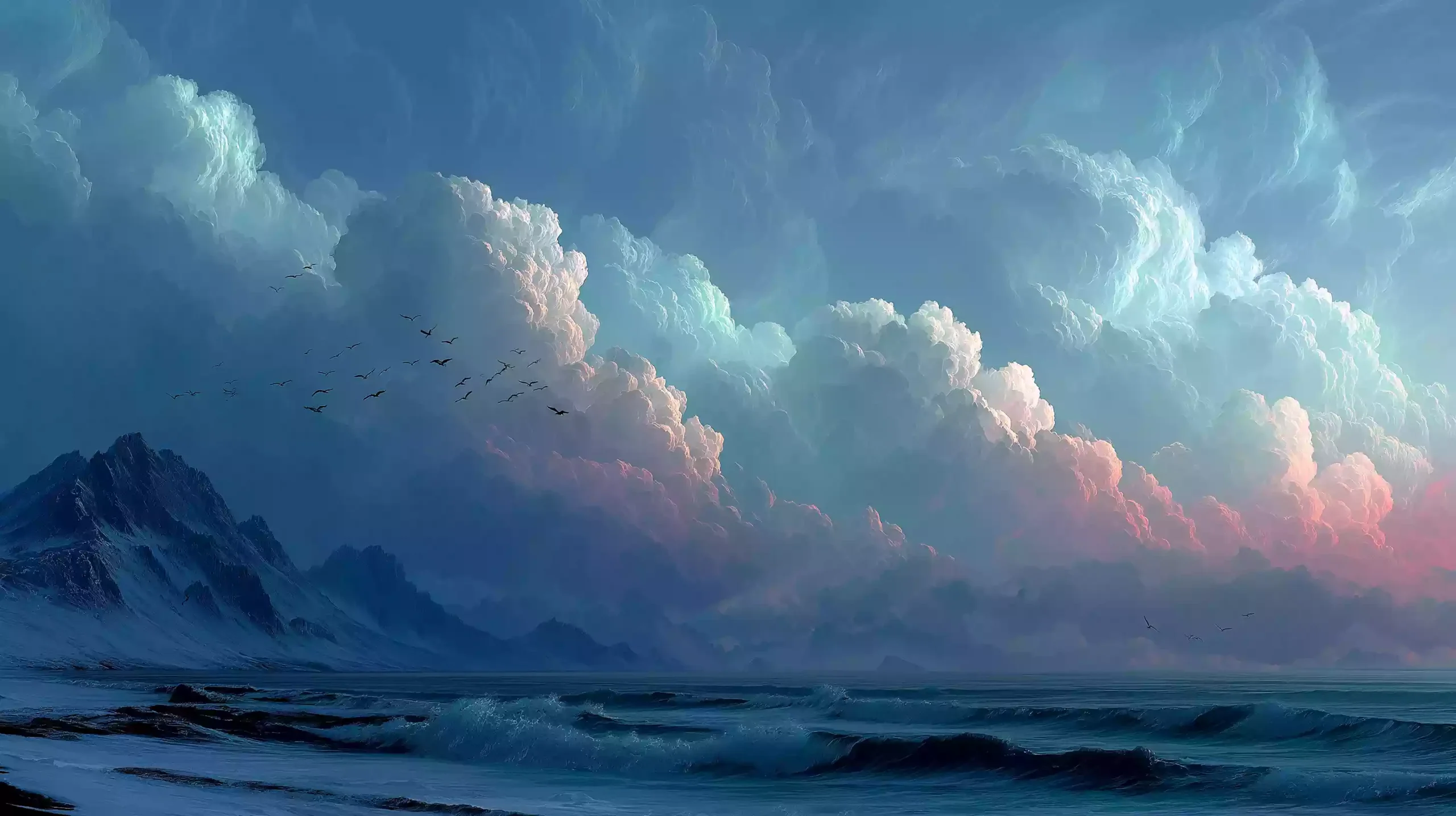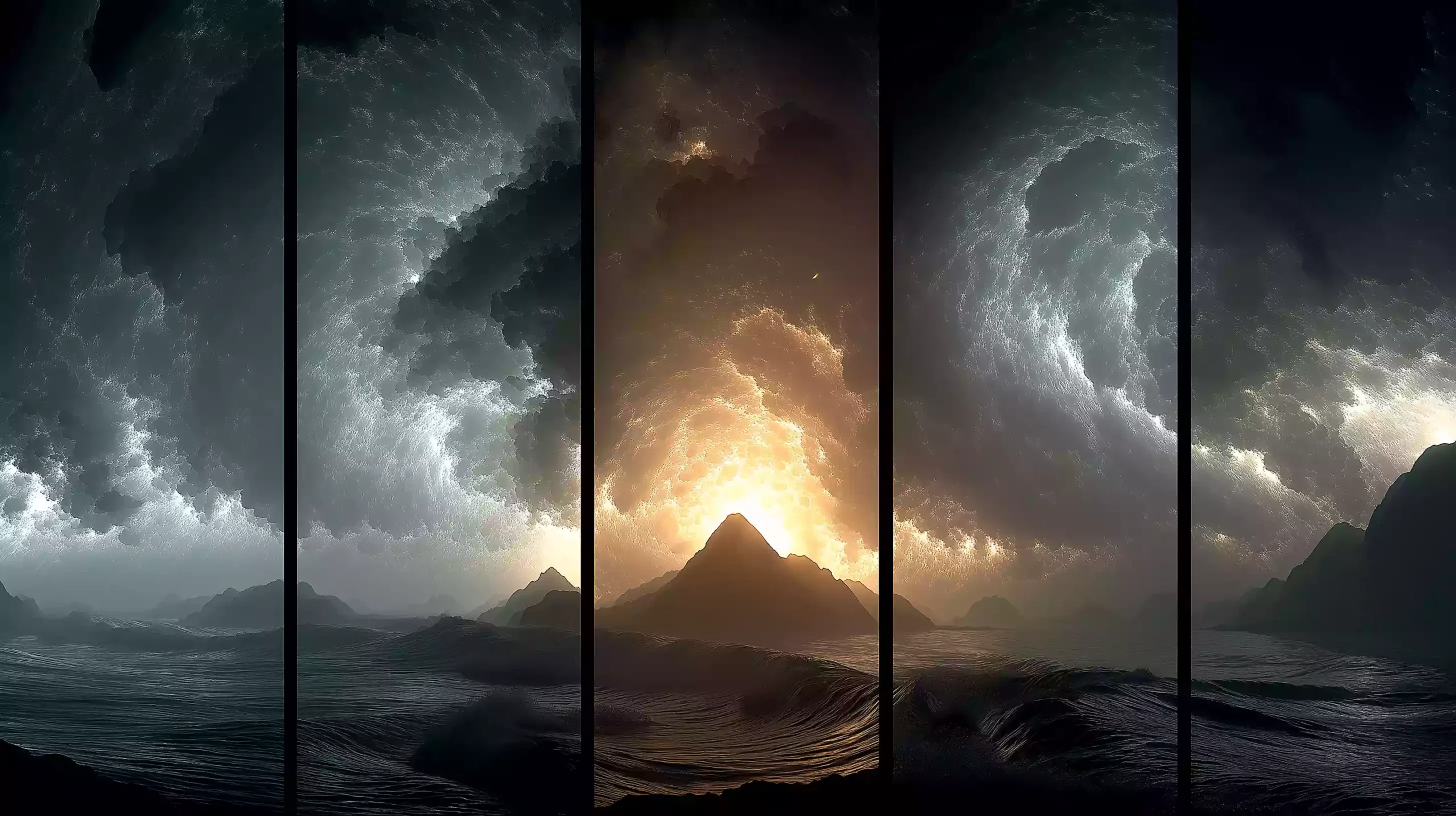 描述:《鲲鹏蜕羽》,据《庄子》鲲鹏神话。画面中宇宙级鲲鹏羽翼脱落星海,羽毛化蓬莱仙岛群(仙境具象),羽轴断裂涌北海巨浪,绒羽飘散成昆仑雪峰(华夏圣山),传递 “水击三千里” 的宏大创世力与仙境意境。