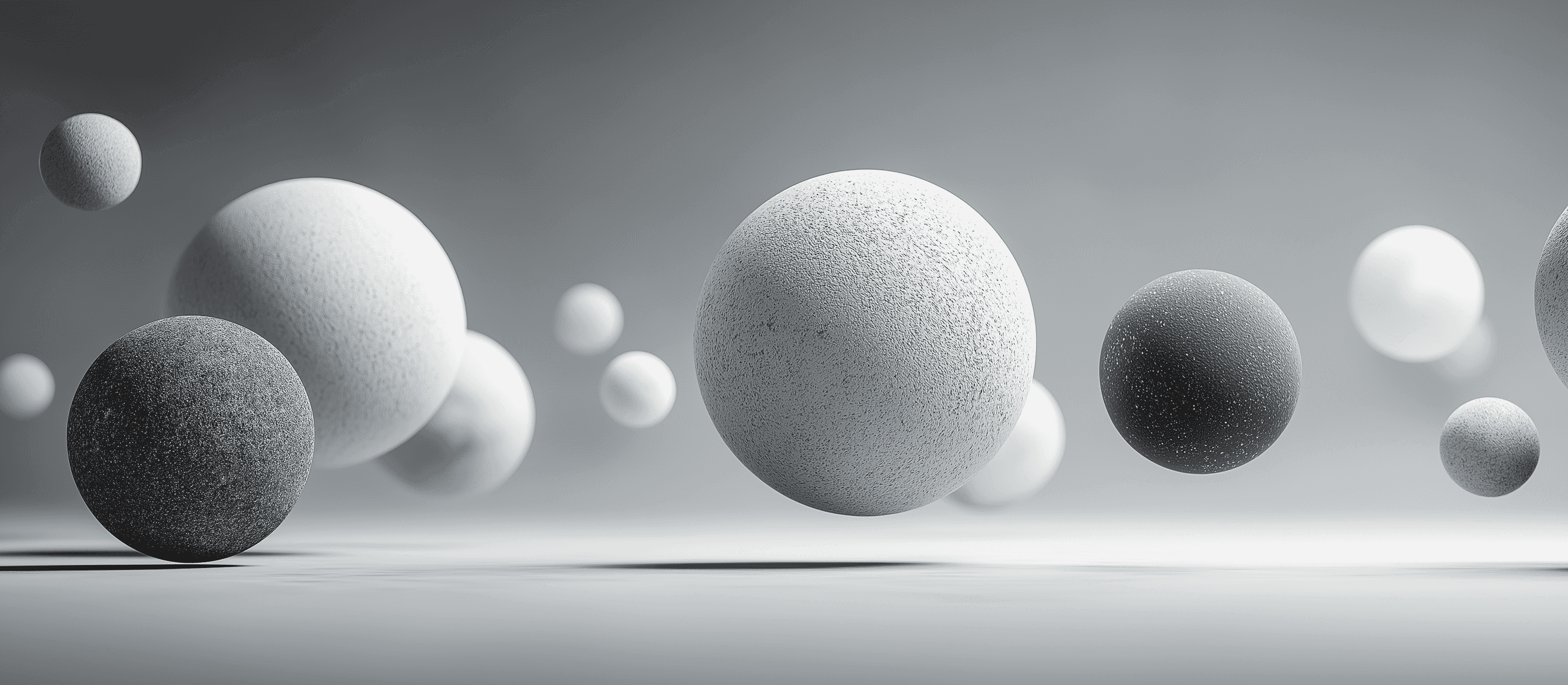 描述:画面呈现多颗不同大小、质感的黑白灰球体,在简约浅灰空间中有序分布,整体风格极简抽象且具科技感,适用于产品展示、科技广告、创意海报等商用场景。